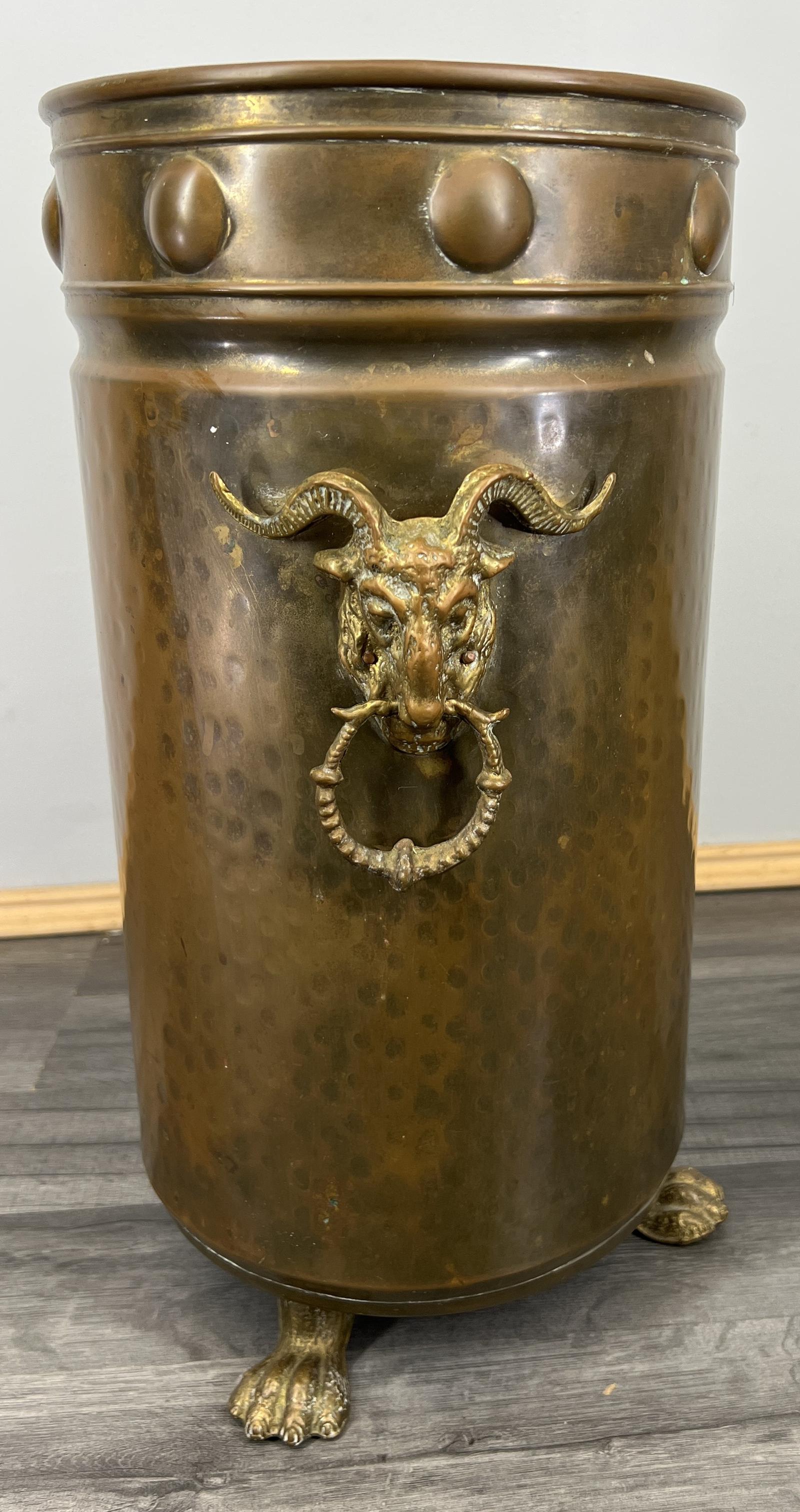 This vintage French umbrella stand showcases a striking cylindrical form crafted in copper and brass, featuring an elegant hammered surface, bold studded rim, and distinctive ram’s head ring handles, all raised on ornate paw feet, and is offered in good vintage condition.