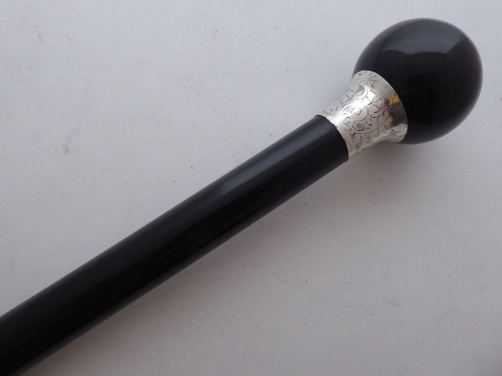 Undertakers Walking Stick Cane 1924 Solid Silver Ebony Wood Shaft Obsidian Top