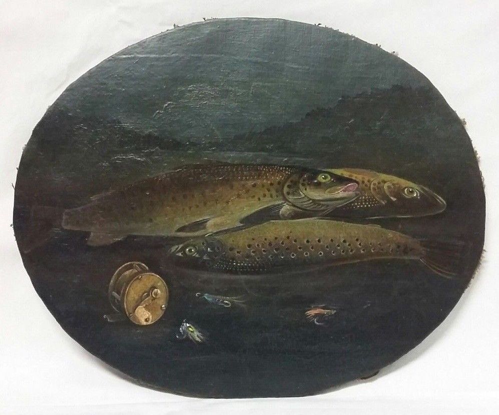 Unique 19th Century Oval 'Study of Trout' Oil On Canvas Painting - Unframed