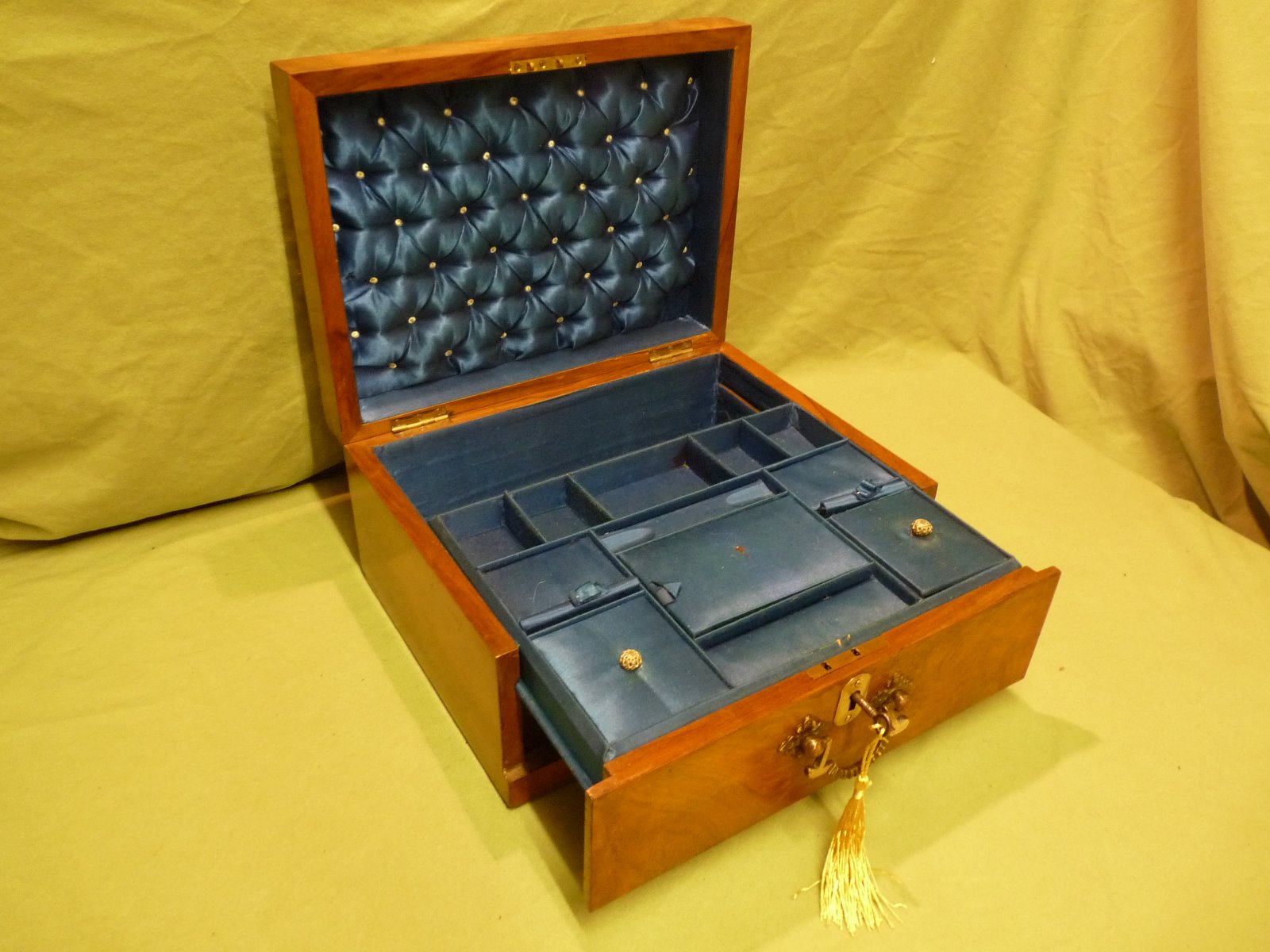 Ununusual Large Figured Walnut Jewellery – Work Box. Plush Interior c.1890