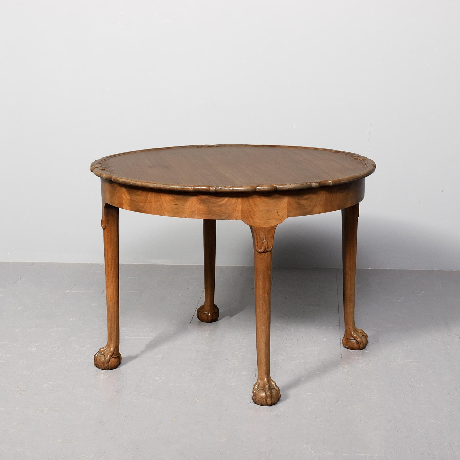 Circa 1930. Whytock & Reid circular mahogany centre table/small dining table. The near circular top with a raised moulded rim with subtle foliate carvings in the manner of Lorimer, over a simple flame mahogany frieze. Supported on four tapering legs with Art Deco style capitals terminating on carved ball and claw feet. In excellent condition, lovely mellow colour and nice patina.