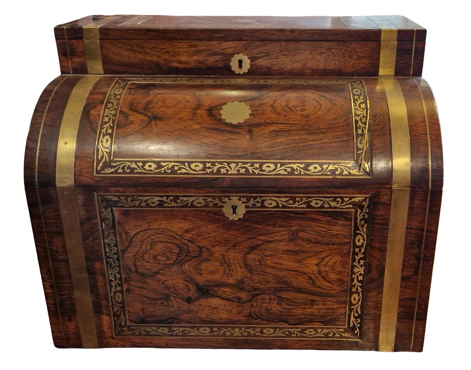 This is a very unusual portable drinks cabinet or tantalus. Made in the early 1900's, it has a beautifully grained rosewood body that has been inlaid with bands of decorative brass. It also has brass escutcheons and vacant cartouches, some of the inlay is missing or is lifting. There are two campaigne style handles for lifting. The box has two lids to open, the top one gives access to a small area of storage, it has a rosewood lining and a small zinc lined box at the center. The larger lid opens to reveal the red silk velvet lined body with storage for six bottles or five bottles and a bowl. The box contains a mixed group of five decanters all missing their stoppers.