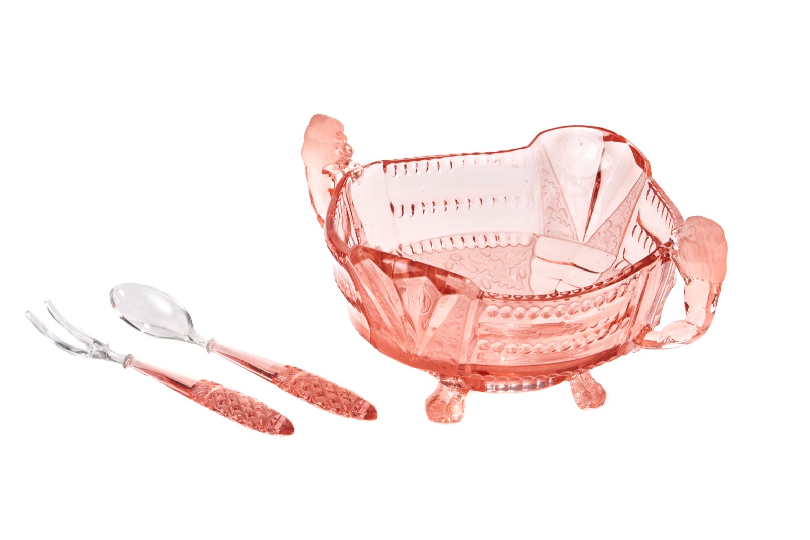 Unusual Art Deco Pink Glass Salad Bowl with Servers