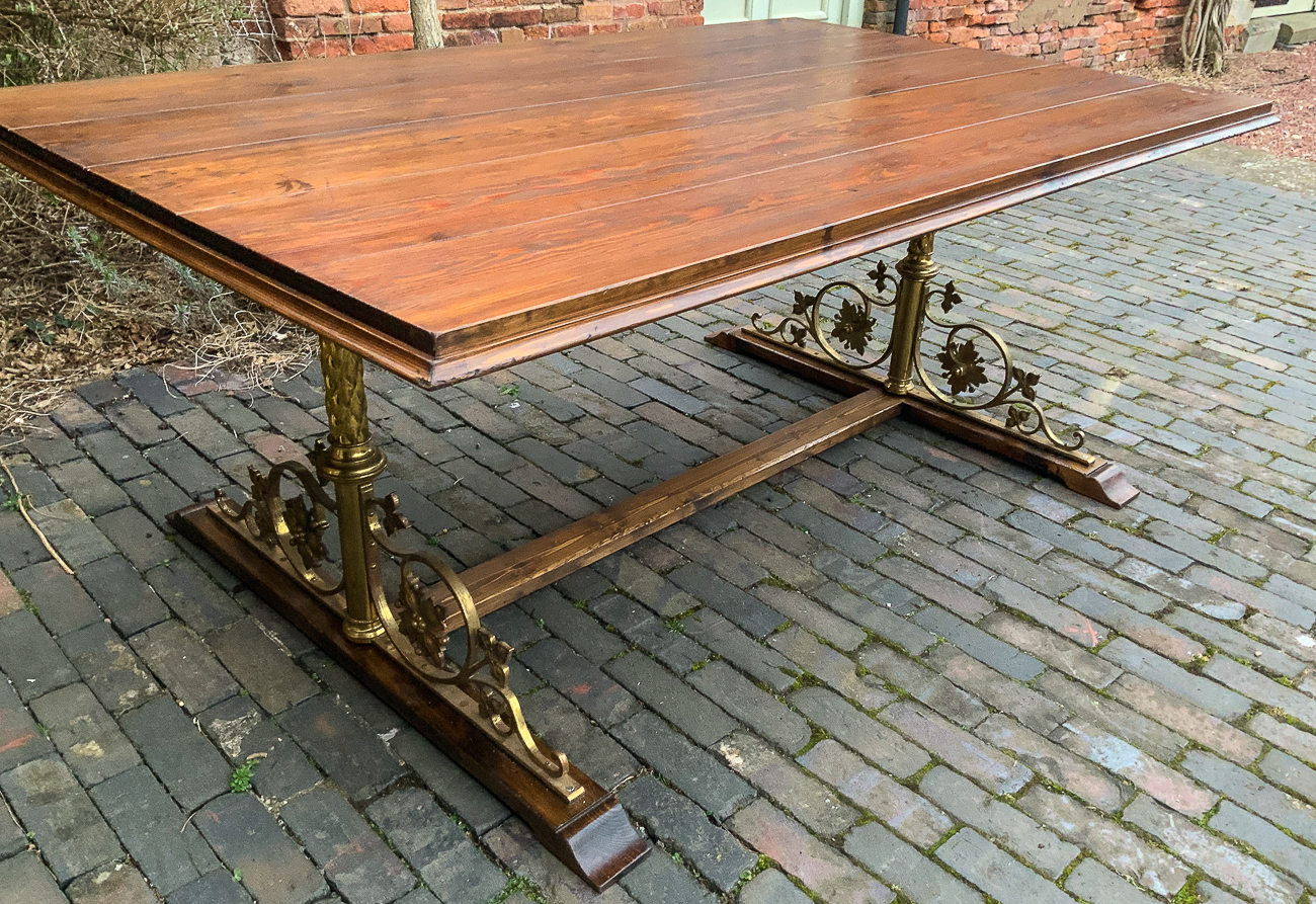 Unusual Dining Table Gothic Brass Supports Pine Top