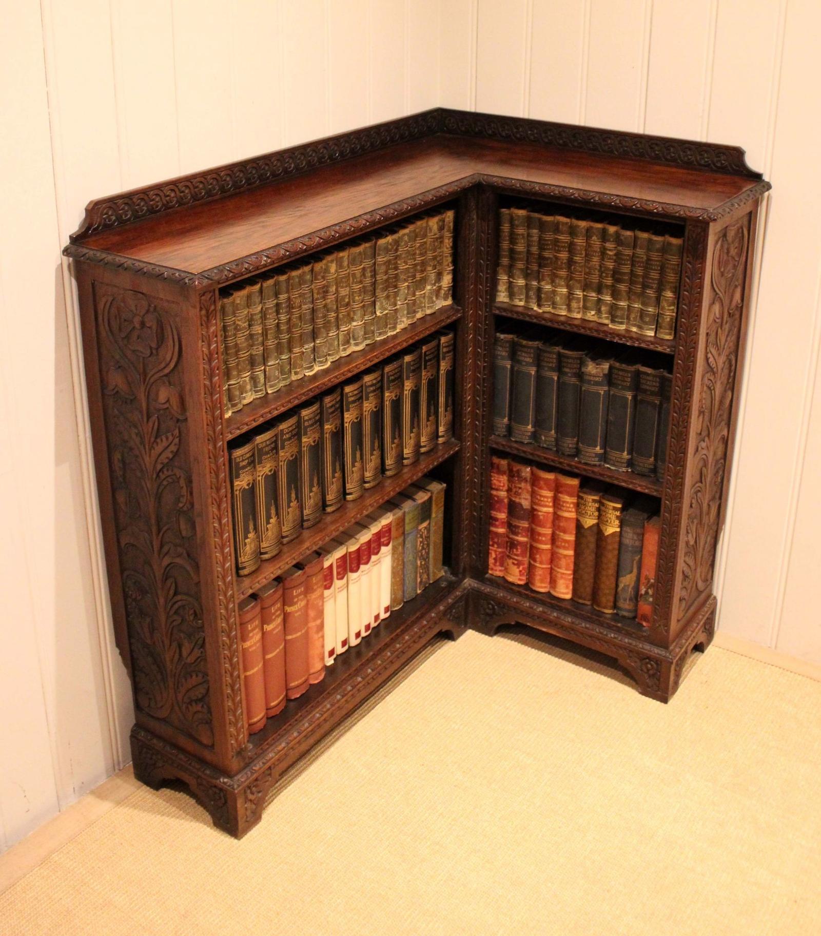 Unusual late 19th century oak corner open bookcase , having three fixed shelves to each side , with decorative carved ends . The right hand side measures 92 cm wide and the shelf dimensions are 61 cm wide and 19 cm deep , the height from the bottom upwards is 27 cm , 23.5 cm and 19.5 cm . The left hand side measures 66 cm wide and the shelf dimensions are 36 cm wide and 19 cm deep with the same heights as the right. ( The shelves are held on brackets which could be moved to suit , the width given is the sum of both left and right )