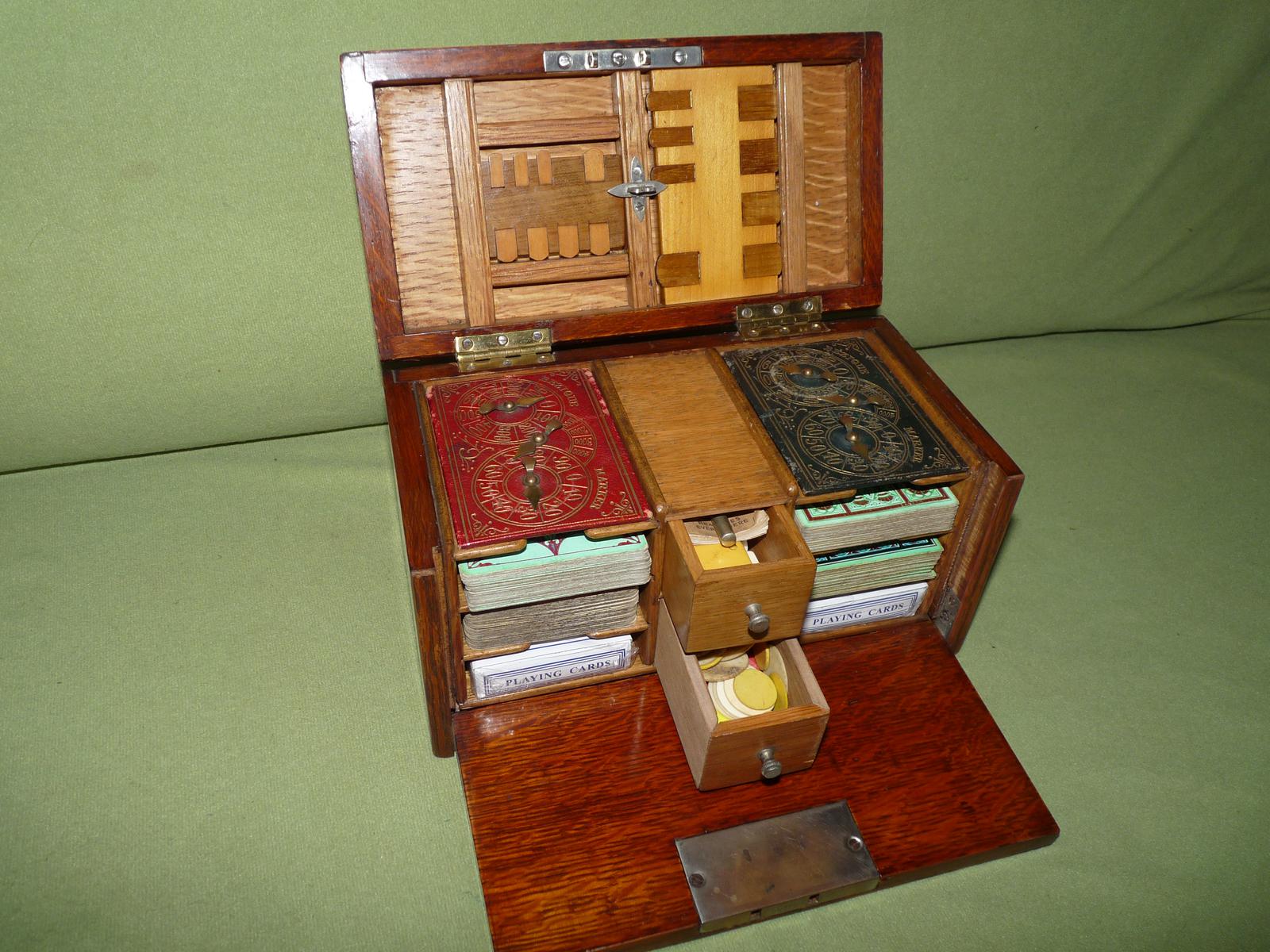 Unusual Oak Games Box - Bezique + Antique Cards + More