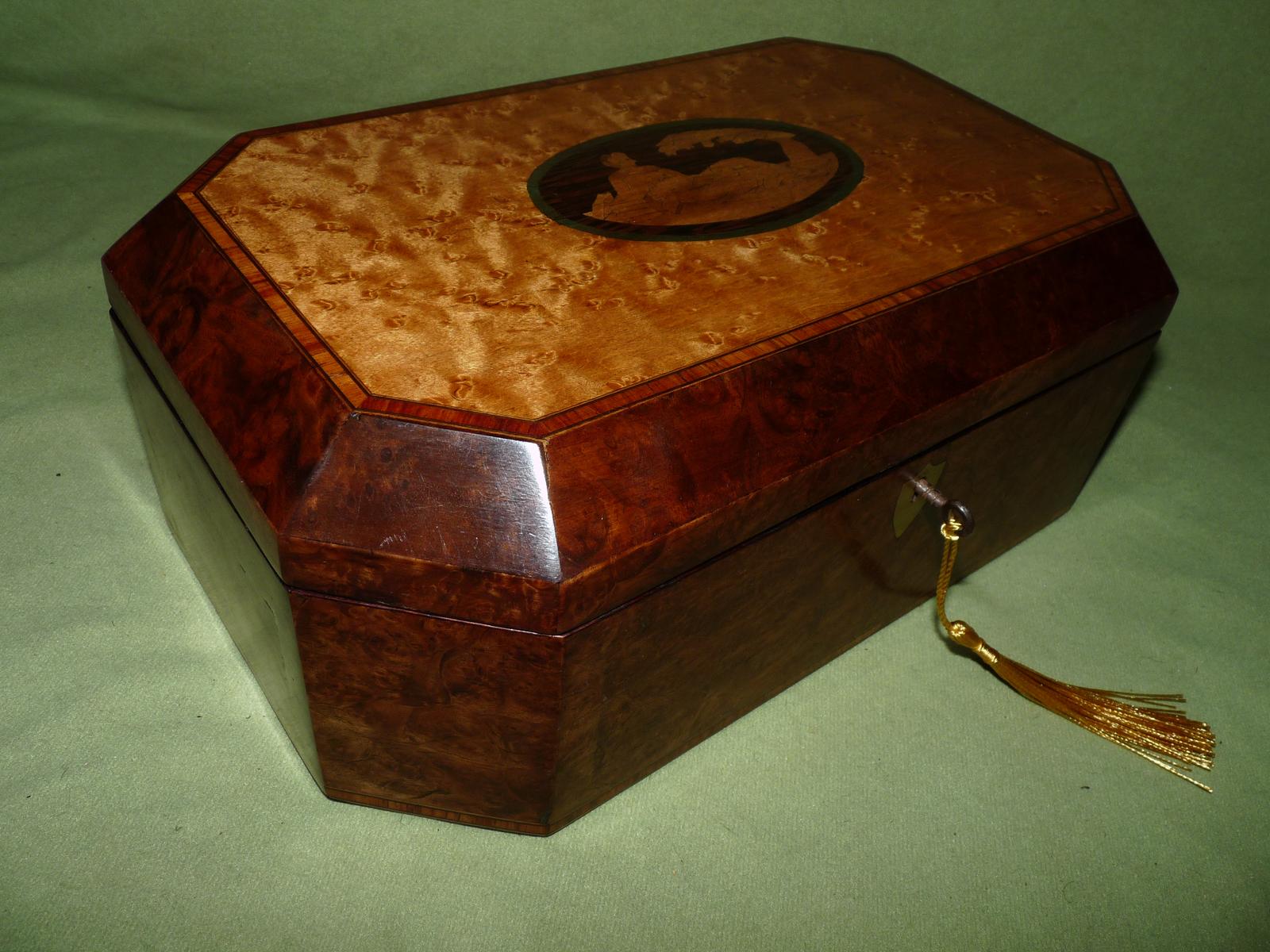 Unusual Octagonal Burr Walnut & Maple Jewellery Box + Tray c.1890