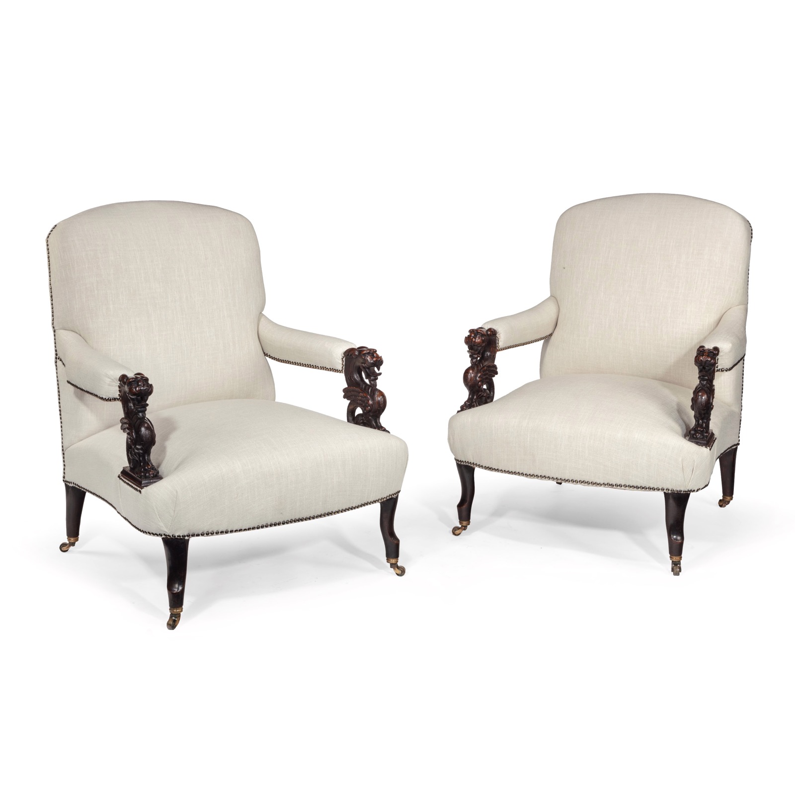 Unusual Pair of 19th Century French Dragons Head Linen Open Armchairs (1 of 1)
