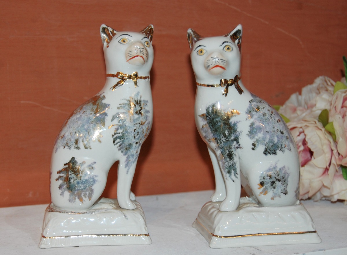 Unusual Pair of 19th Century Pottery Cats with Gilt Lustre Decoration