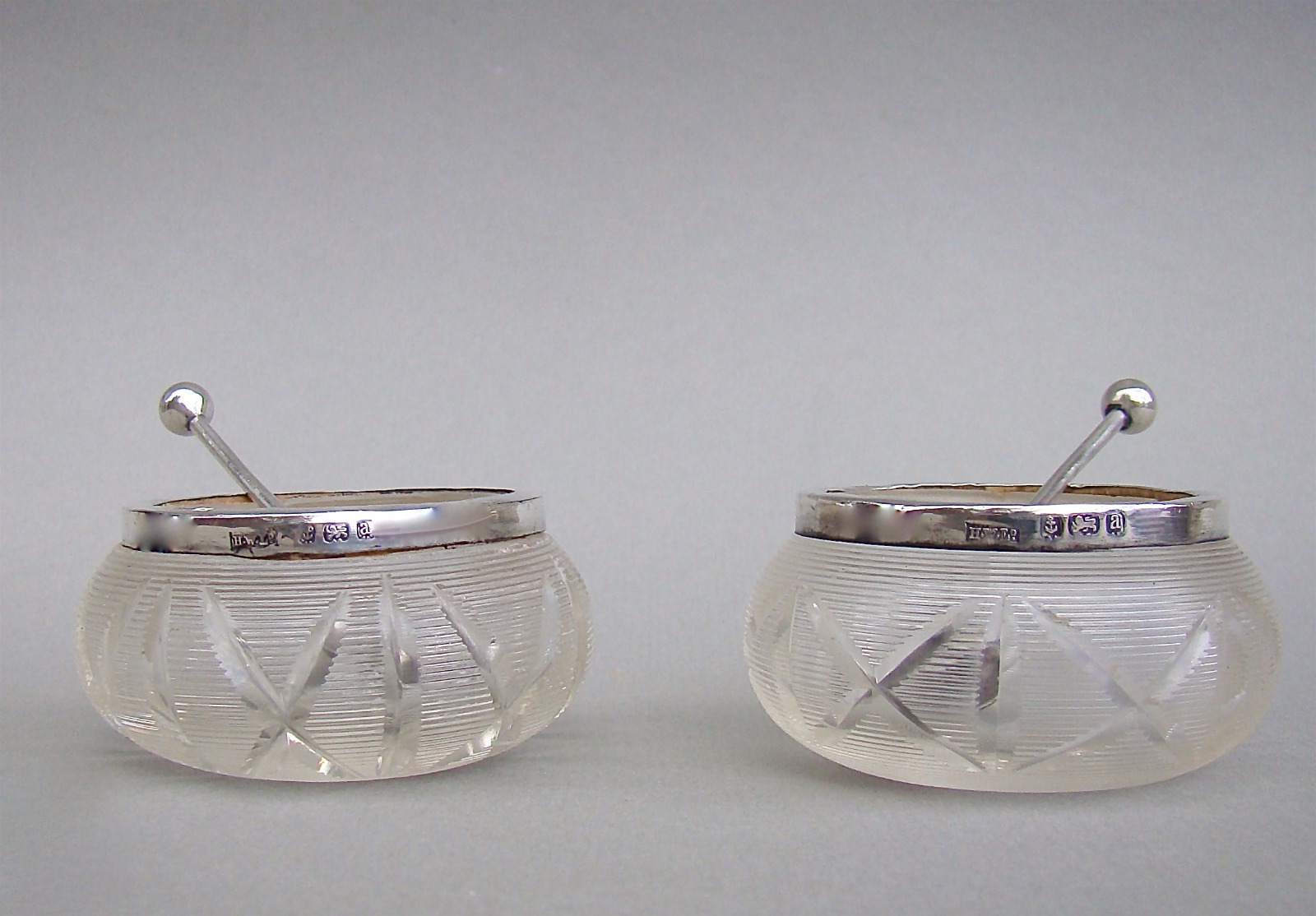 Unusual Pair of Silver Mounted Ribbed Glass Salts with Spoons by Henry Wiilliamson Ltd, Birmingham 1900