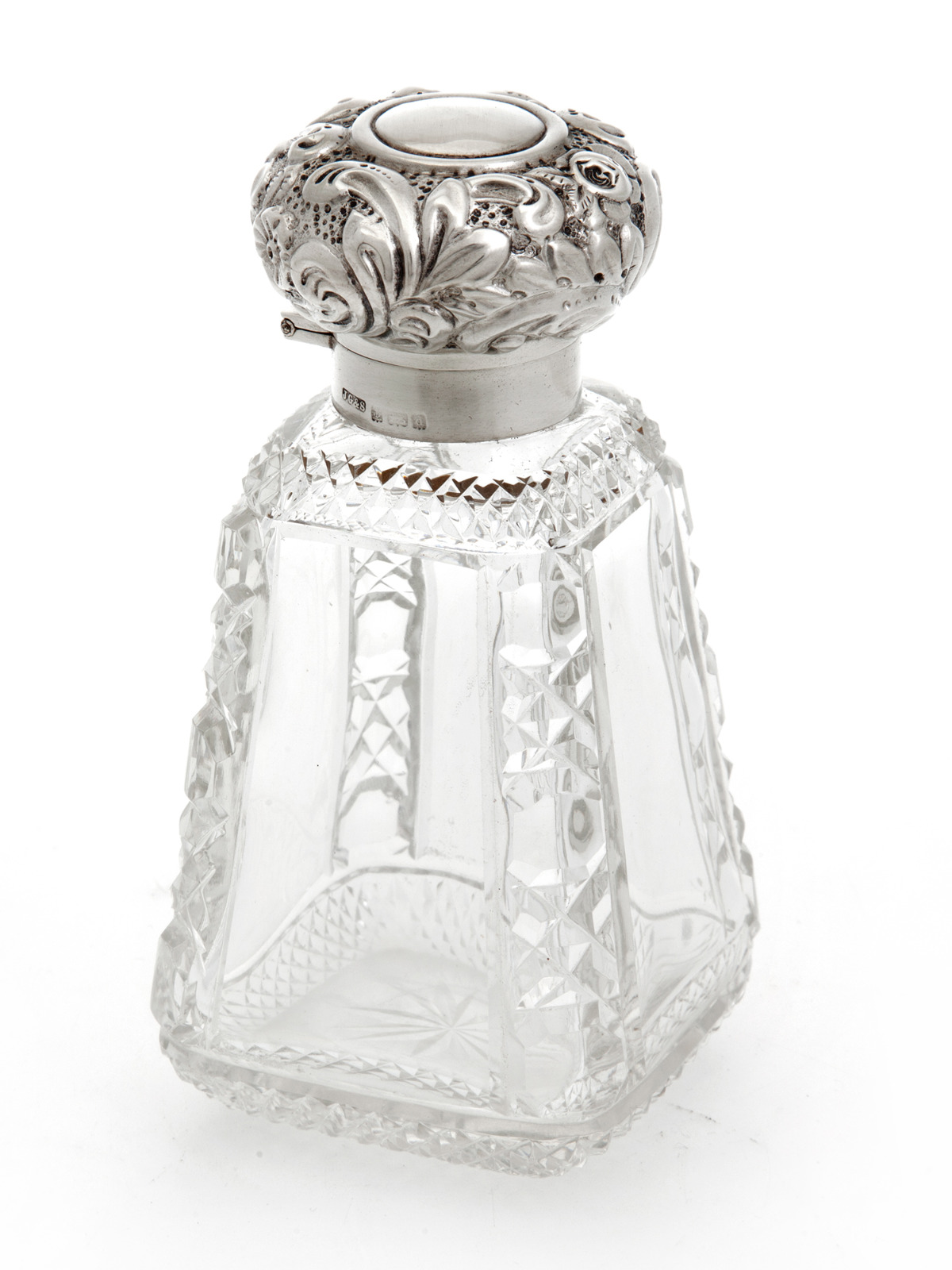 Unusual Pyramid Shape Antique Cut Glass & Silver Topped Perfume Bottle (1 of 1)