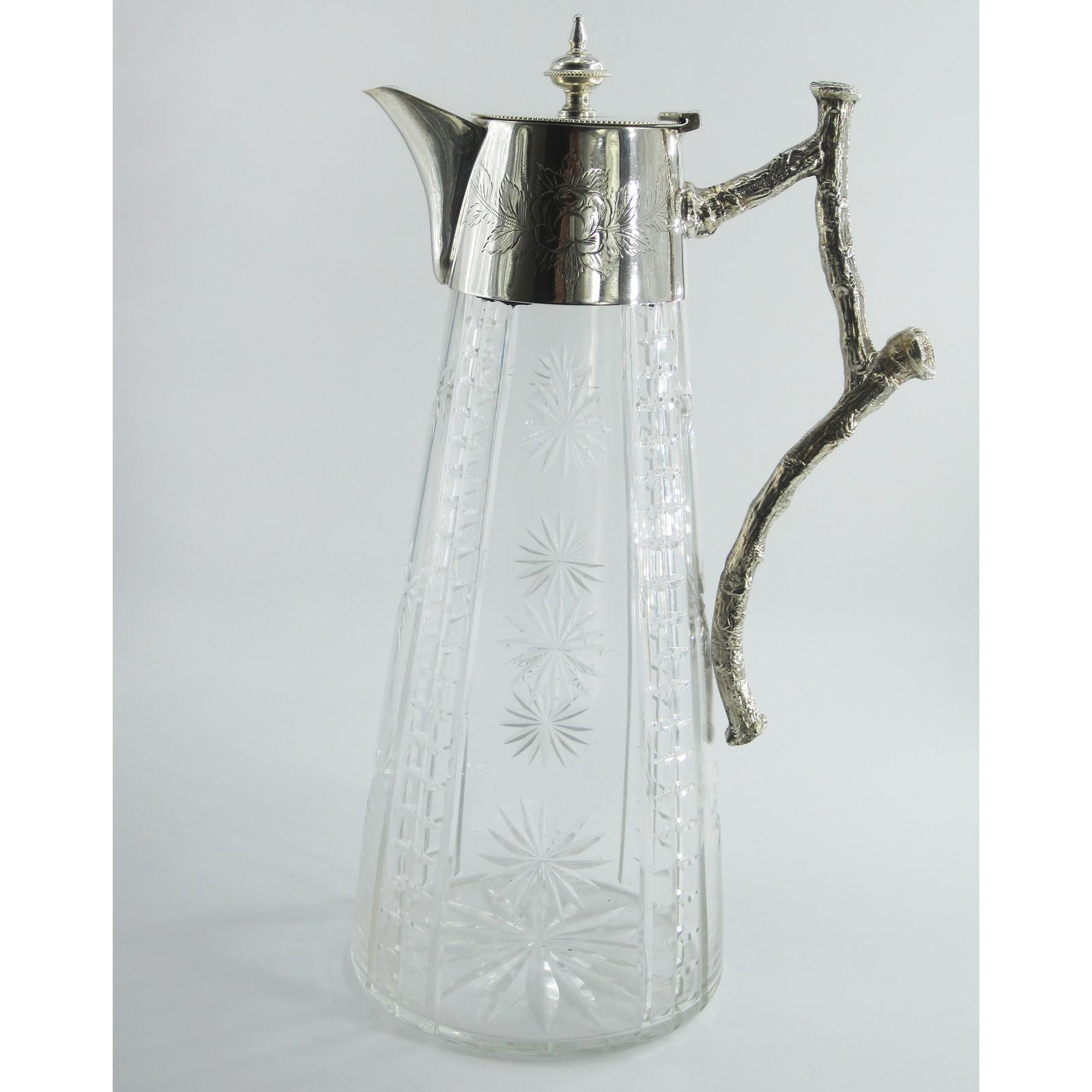 Unusual Rustic Victorian Silver Plate Claret Jug with Floral Engraved Mount