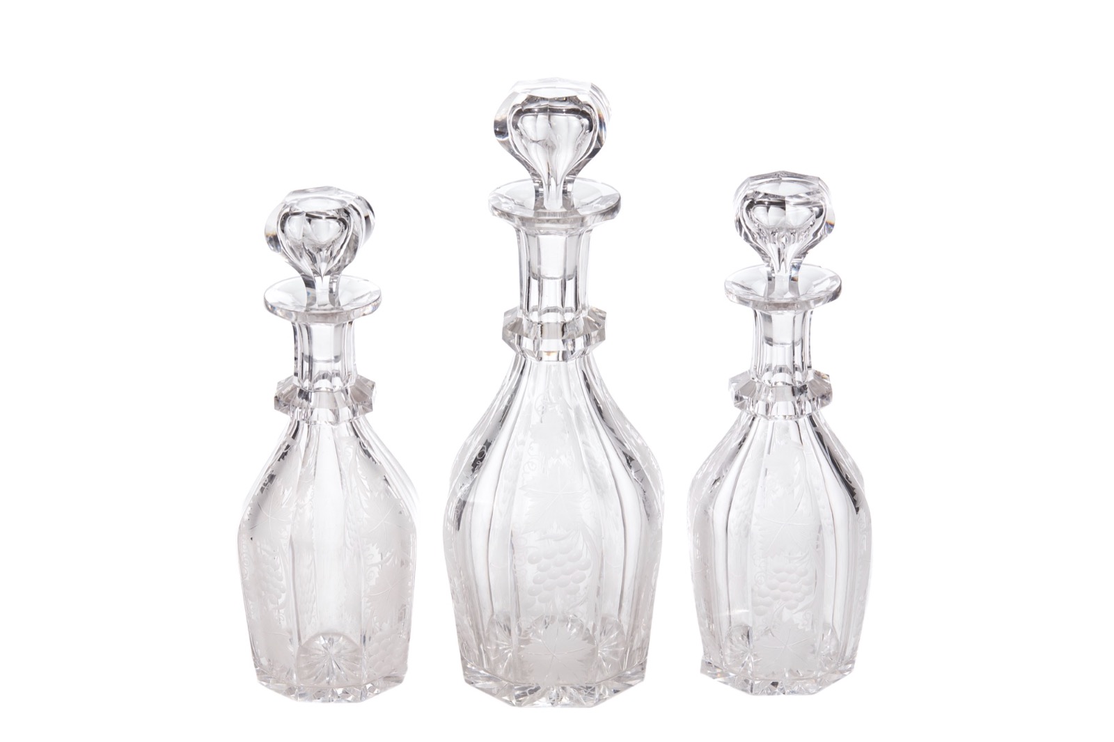 Unusual Set of 3 Antique Etched Glass Decanters c.1870