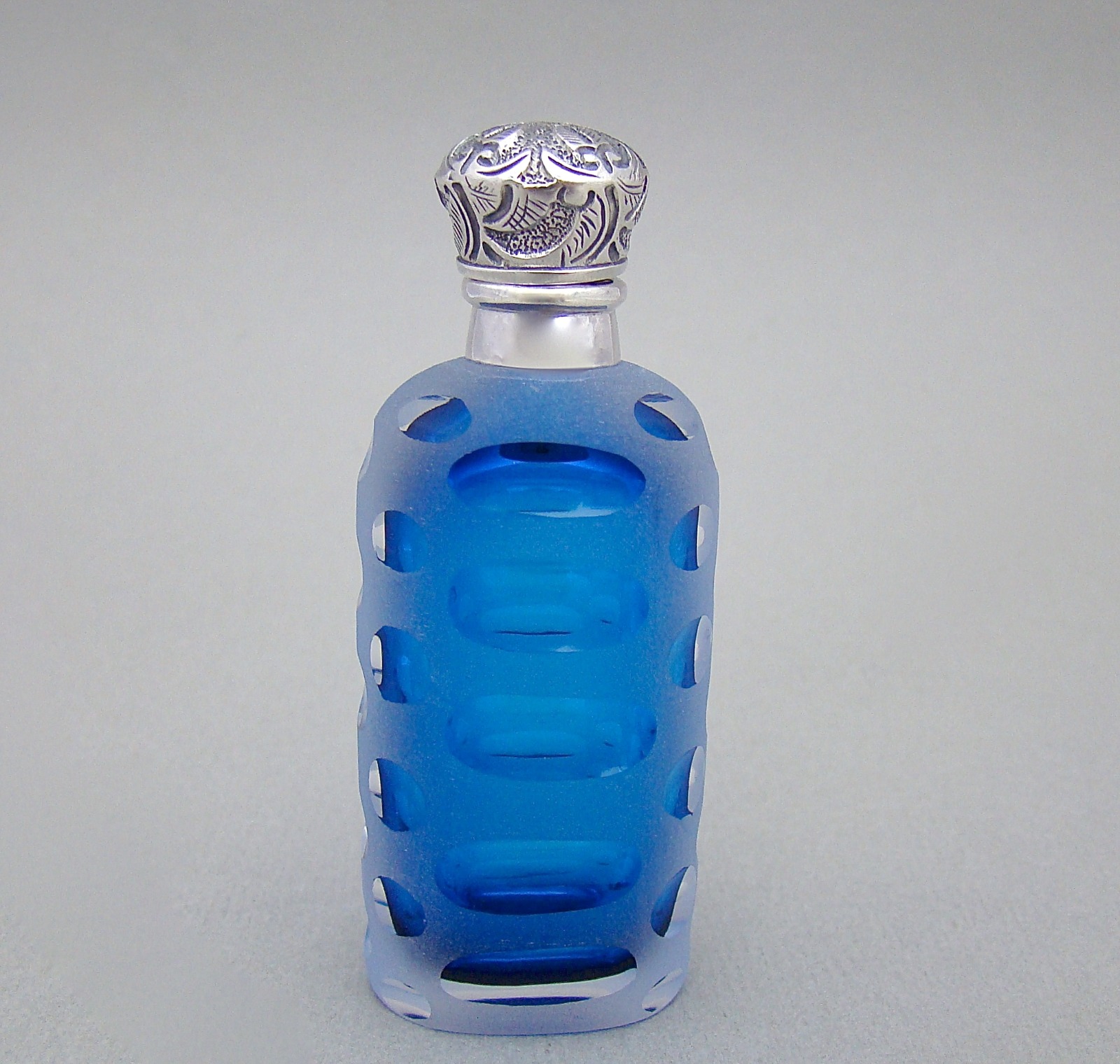 Unusual Silver Mounted Frosted Turquoise Glass Scent Bottle c.1890