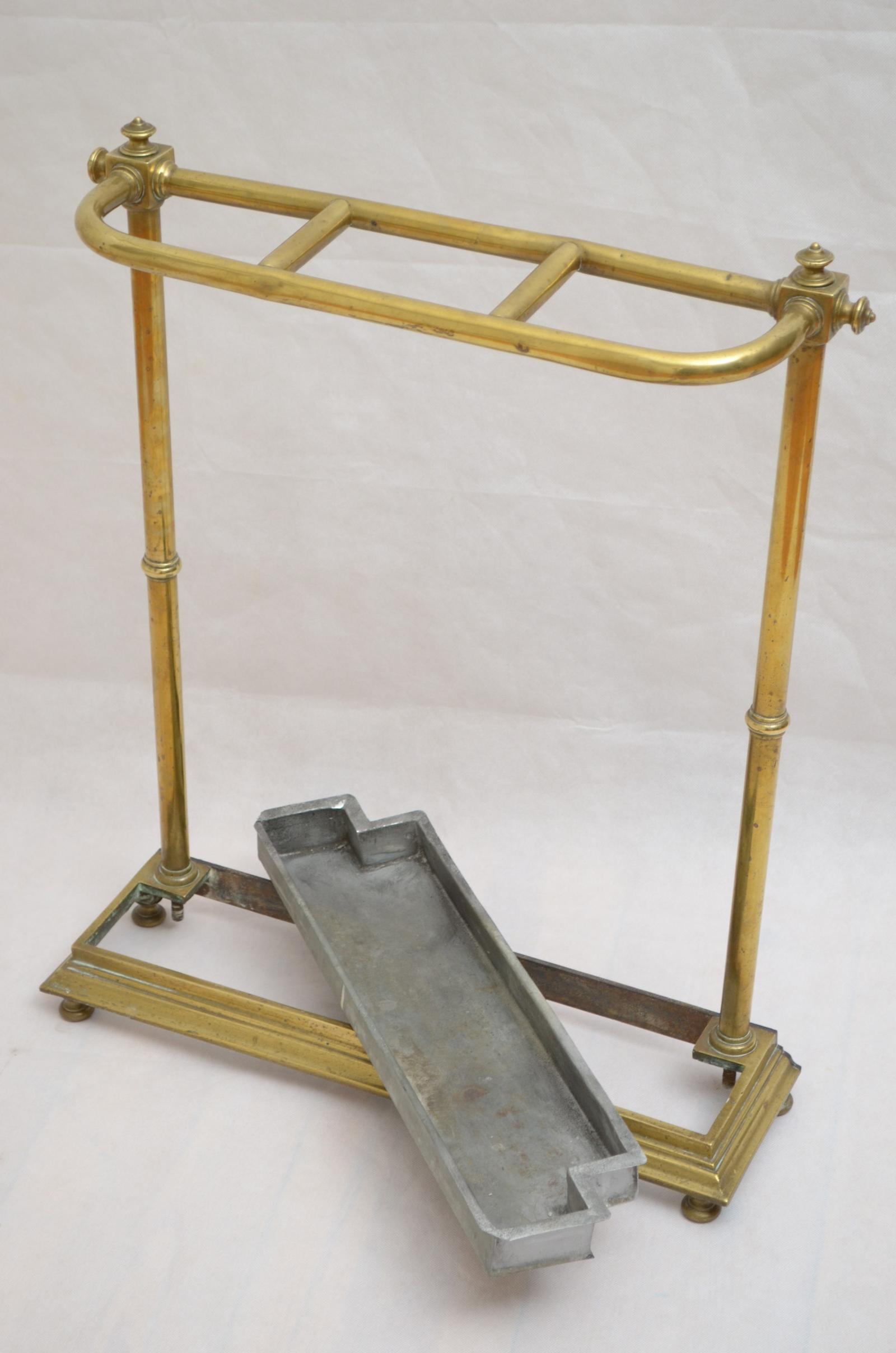 Stylish and very unusual 19th century brass umbrella stand / stick stand, having three umbrella compartments with four decorative finials, supported on two ringed uprights terminating in moulded base enclosing original drip tray, standing on original bun feet. This rare umbrella stand has been cleaned and polished and it is in home ready condition.