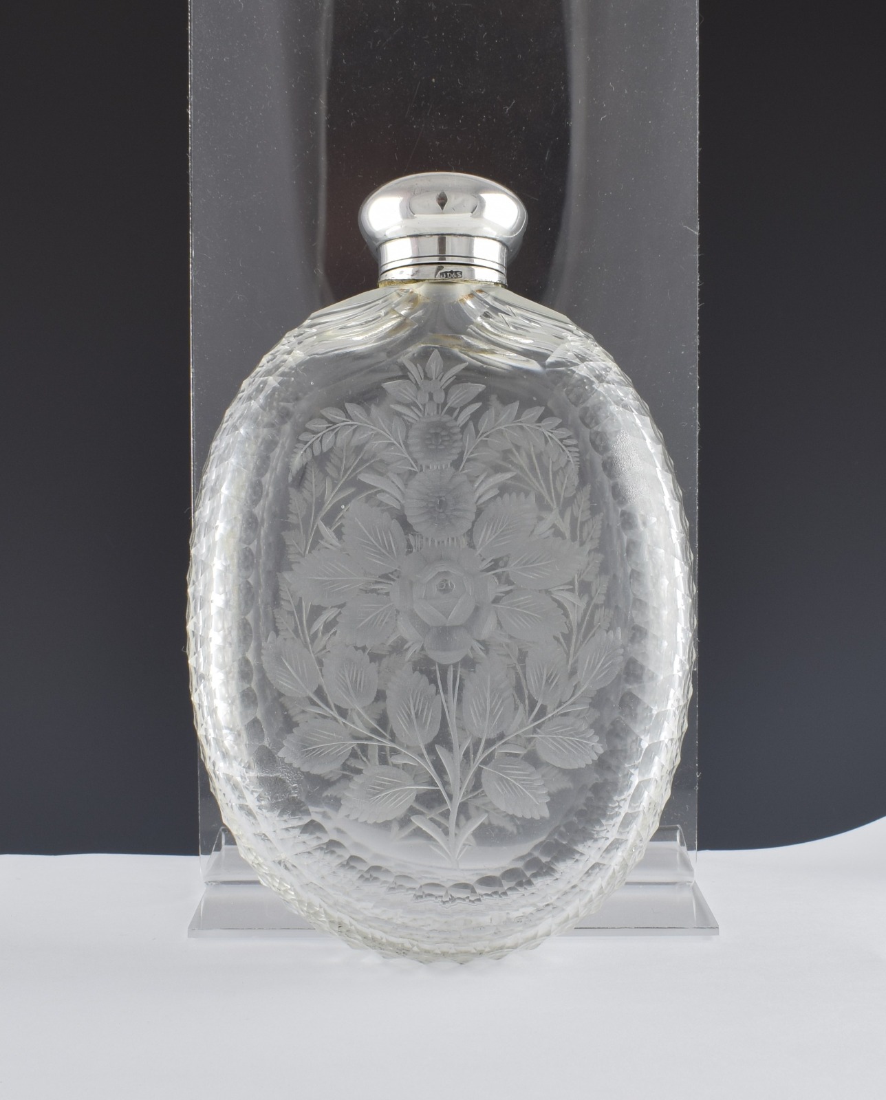 Unusual Victorian Engraved Cut Glass & Silver Plated Hip Spirit Flask