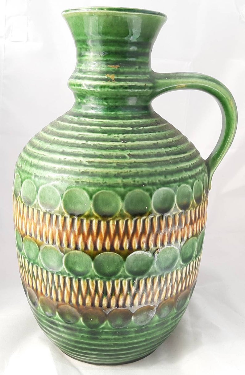 Unusual West German Pottery Vase in Green & Yellow Tones with Circle / Dimple Decoration