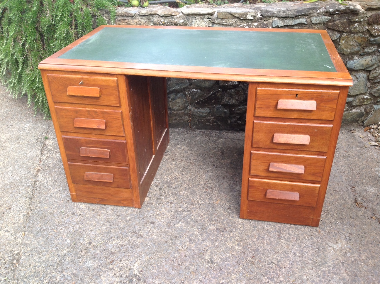 Utilitarian Solid Oak Pedestal Desk Inset Top Lockable Drawers 1950s