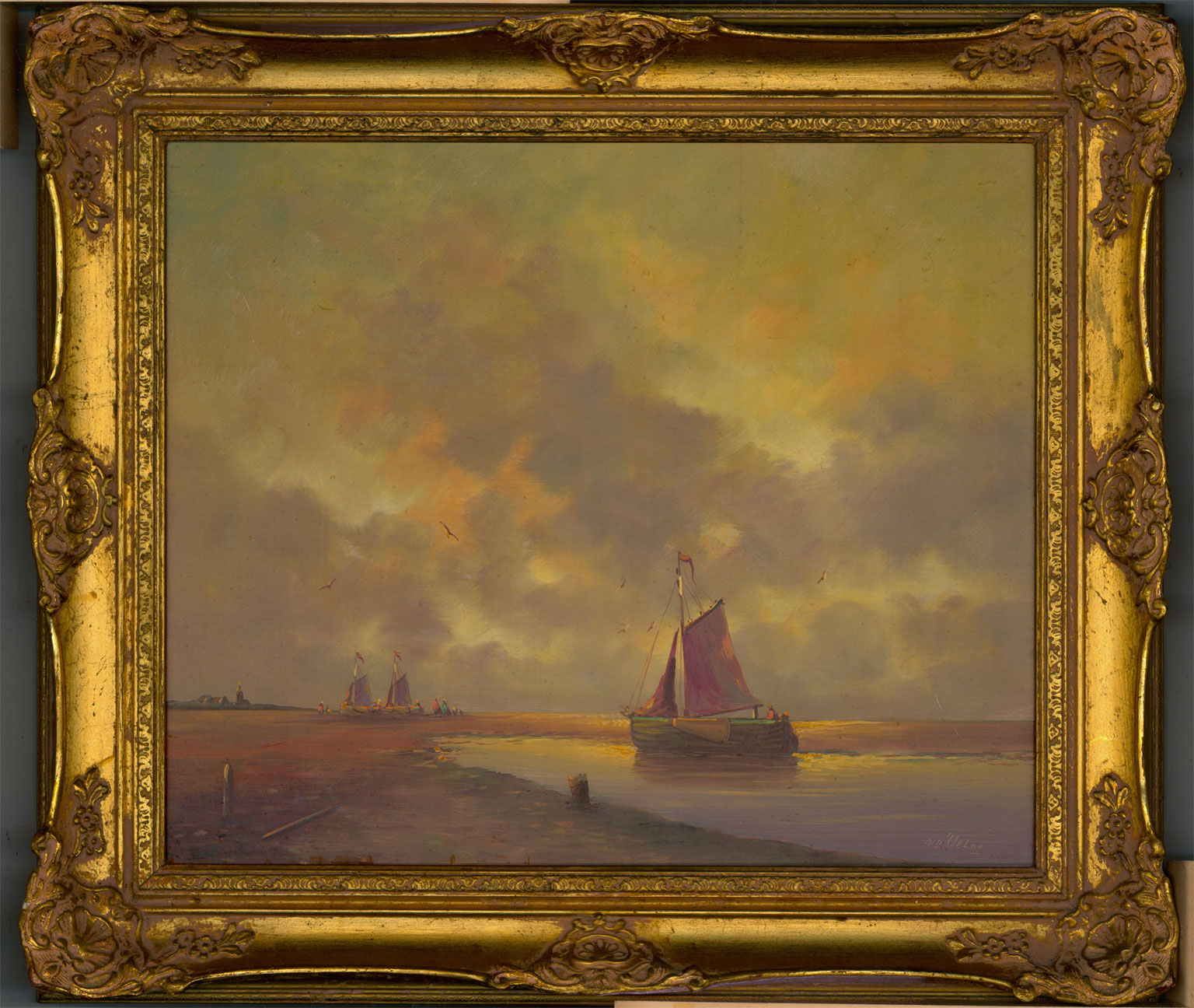 Van Der Velde - Fine Gilt Framed Contemporary Dutch Oil, Boats Near Den Helder