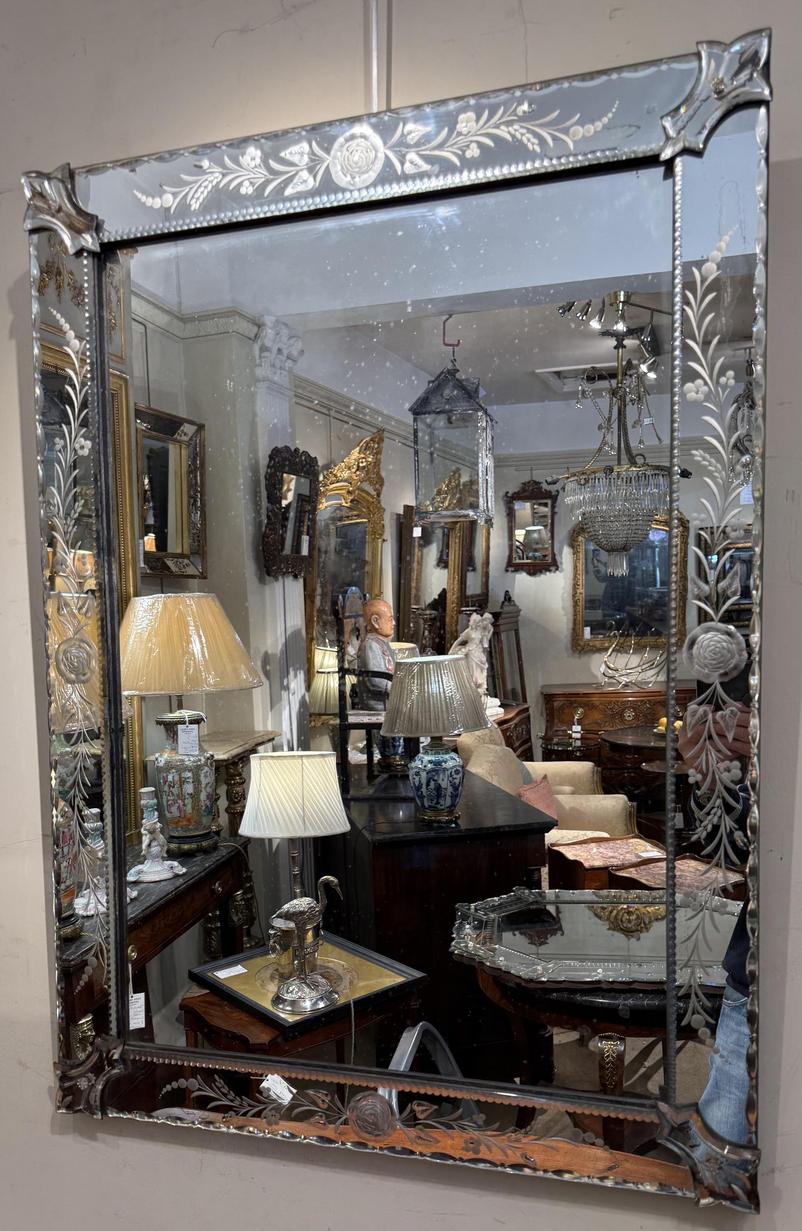 A very decorative Venetian mirror, dating to the early 20th Century, rectangular in shape, symmetrical so can be used landscape or portrait position. All in excellent condition with usual small areas of patination to the mirrored glass. Decorated with floral and rose motifs etched and cut glass.