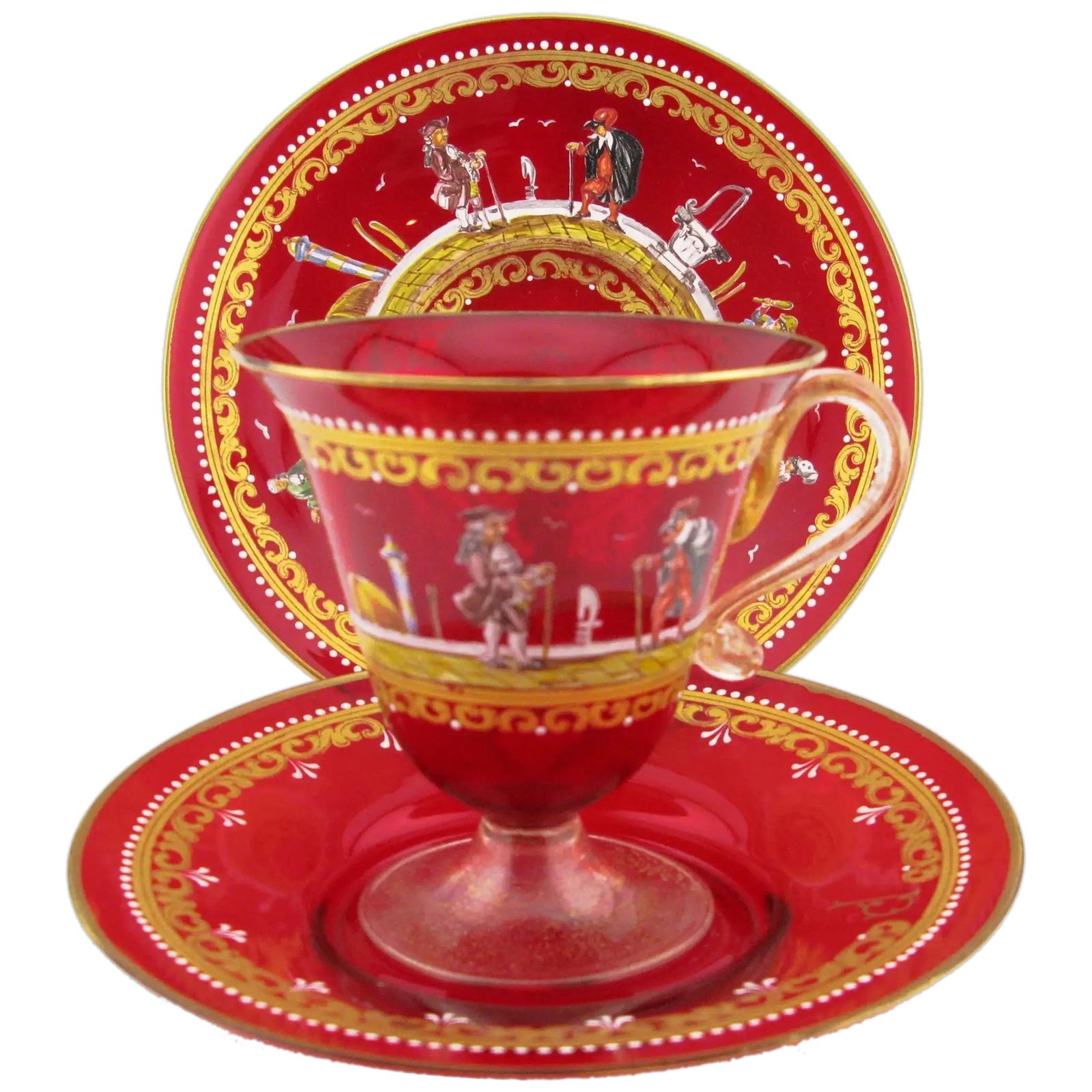 Venetian Murano Commedia Dell'arte Enamel Ruby Glass Cup Saucer Trio