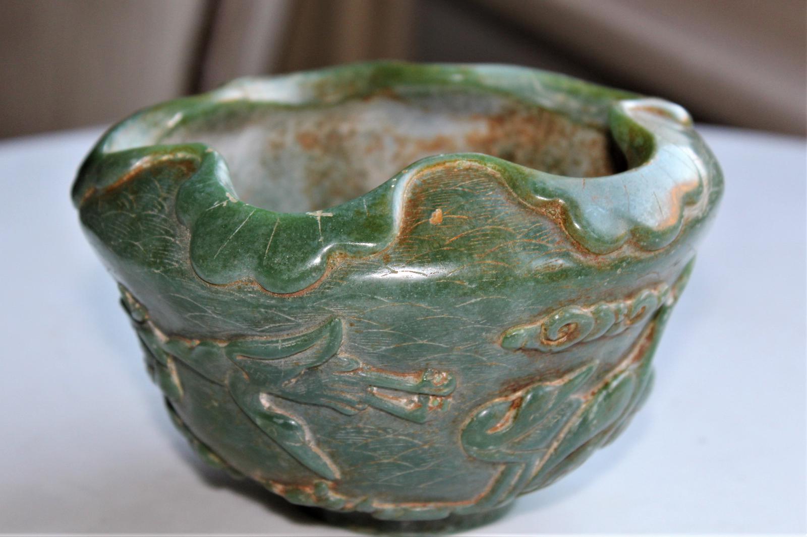 Very attractive green jade Chinese bowl with decoration of cherry blossom and birds