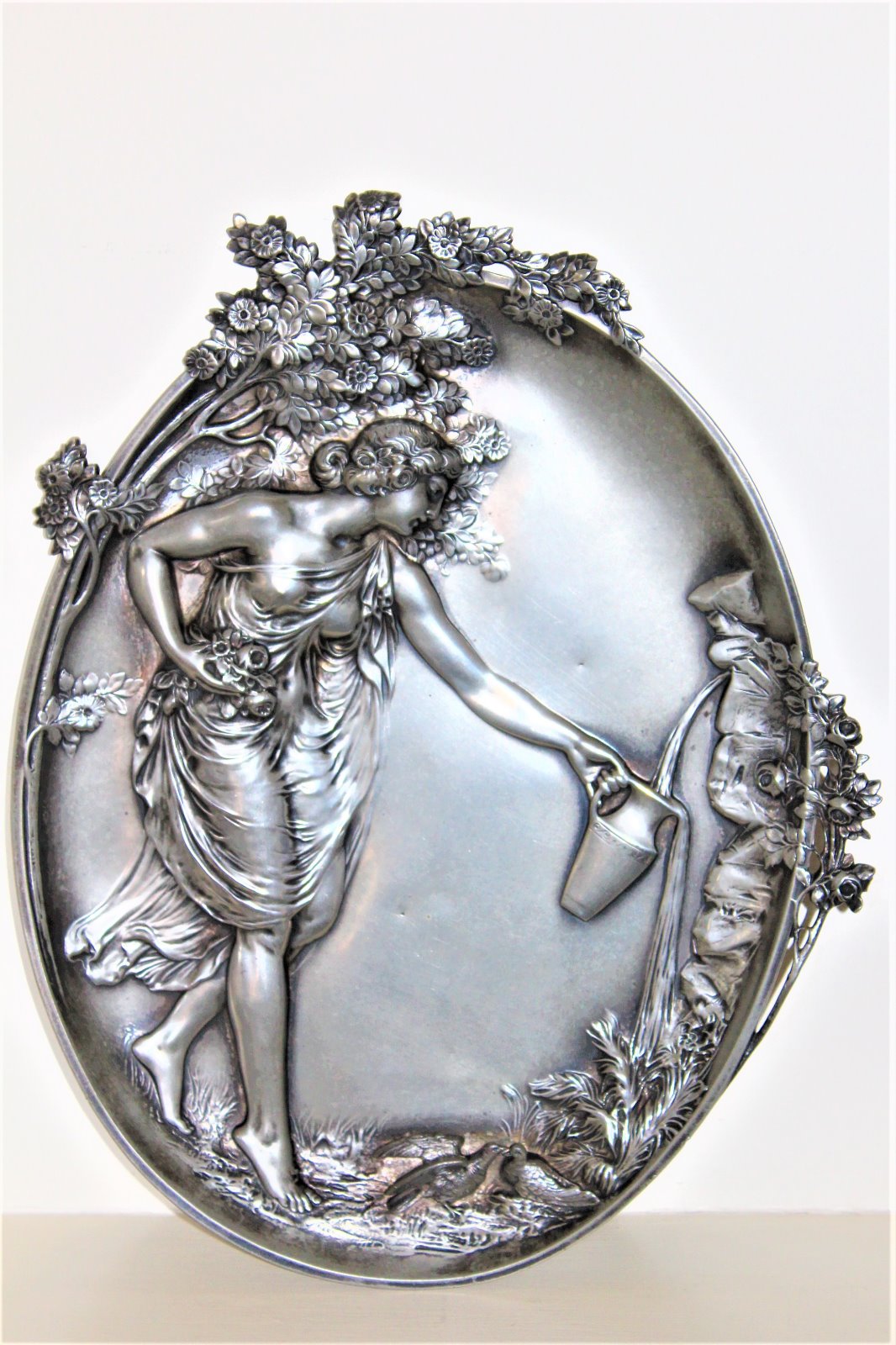 Very Fine Large Pewter Art Nouveau Plaque Depicting a Beautiful Maiden Filling a Ewer at a Well Continental c.1890 to 1920