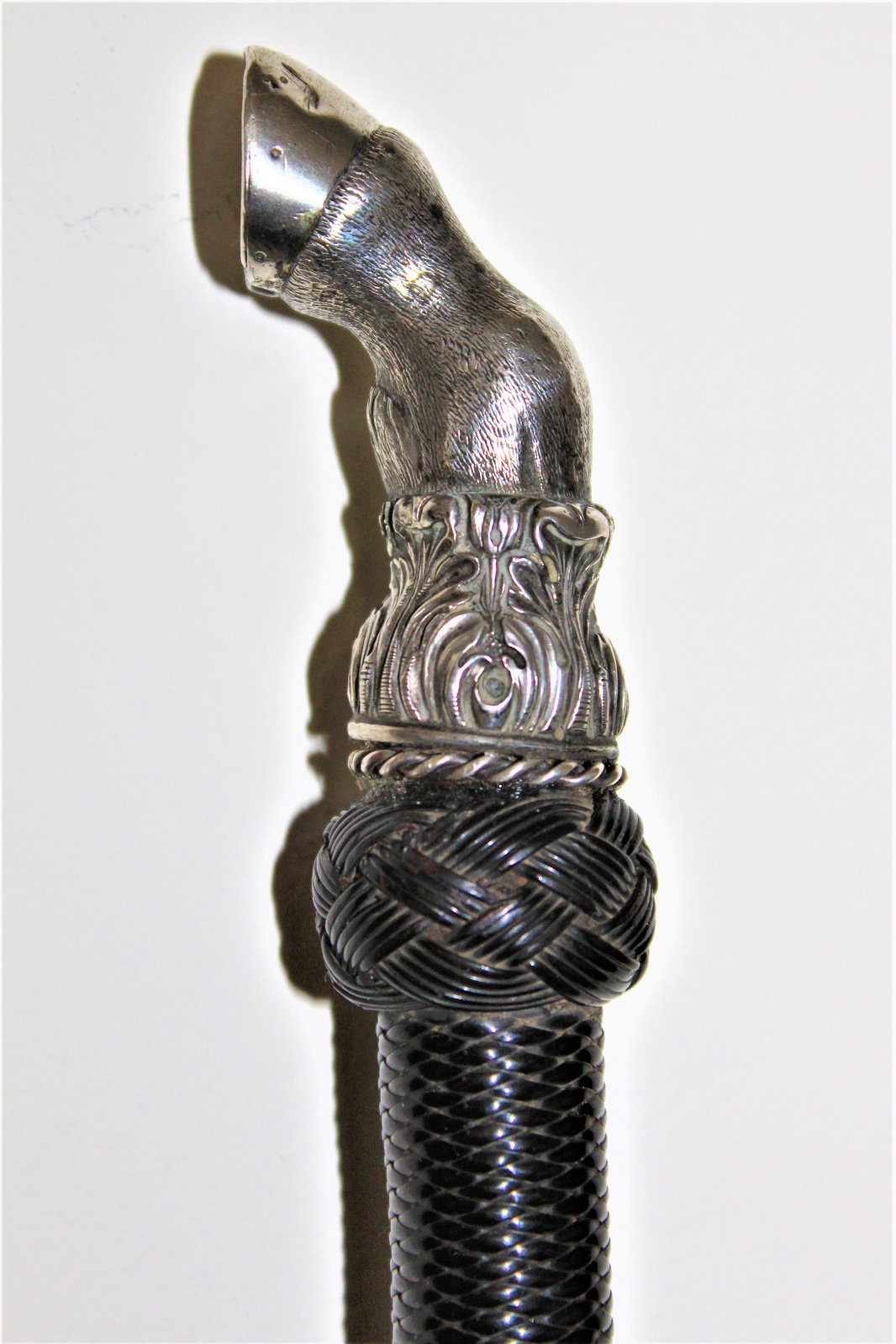 Very Fine Riding Crop with a Well Cast White Metal Horses Hoof and Nicely Woven Leather c.1890