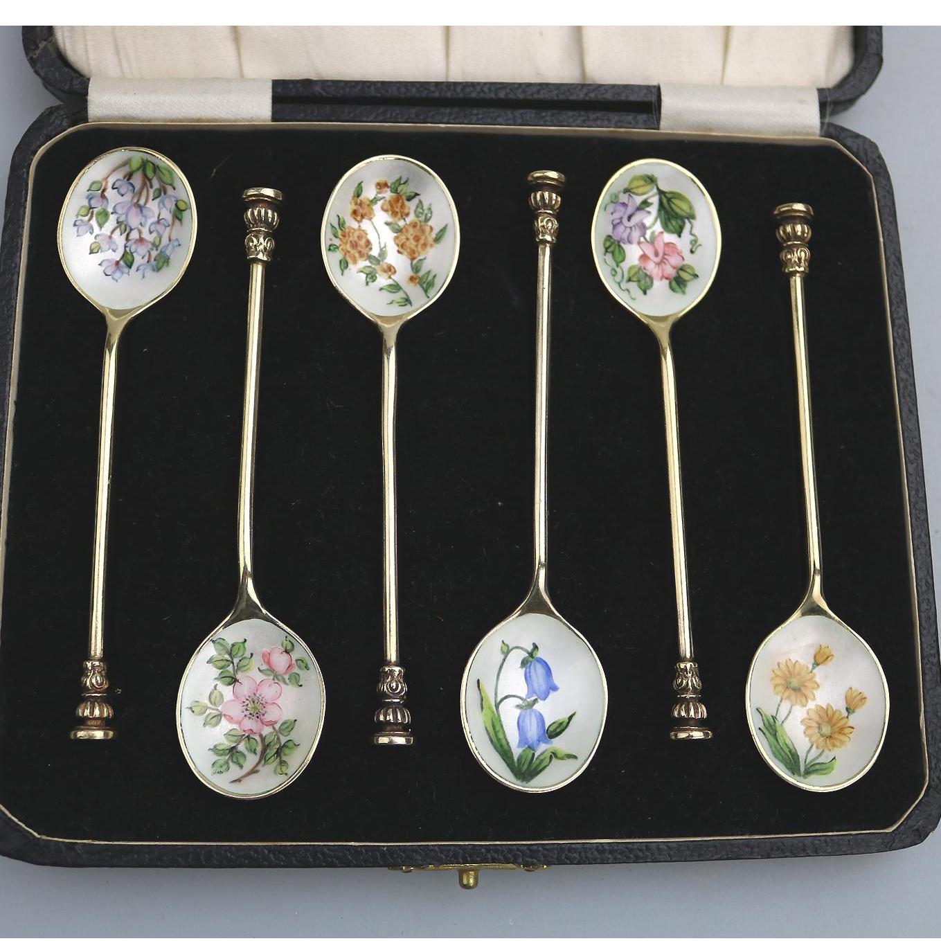 Very Fine Set of Solid Silver & Enamel Seal End Gilt Coffee Spoons c.1968