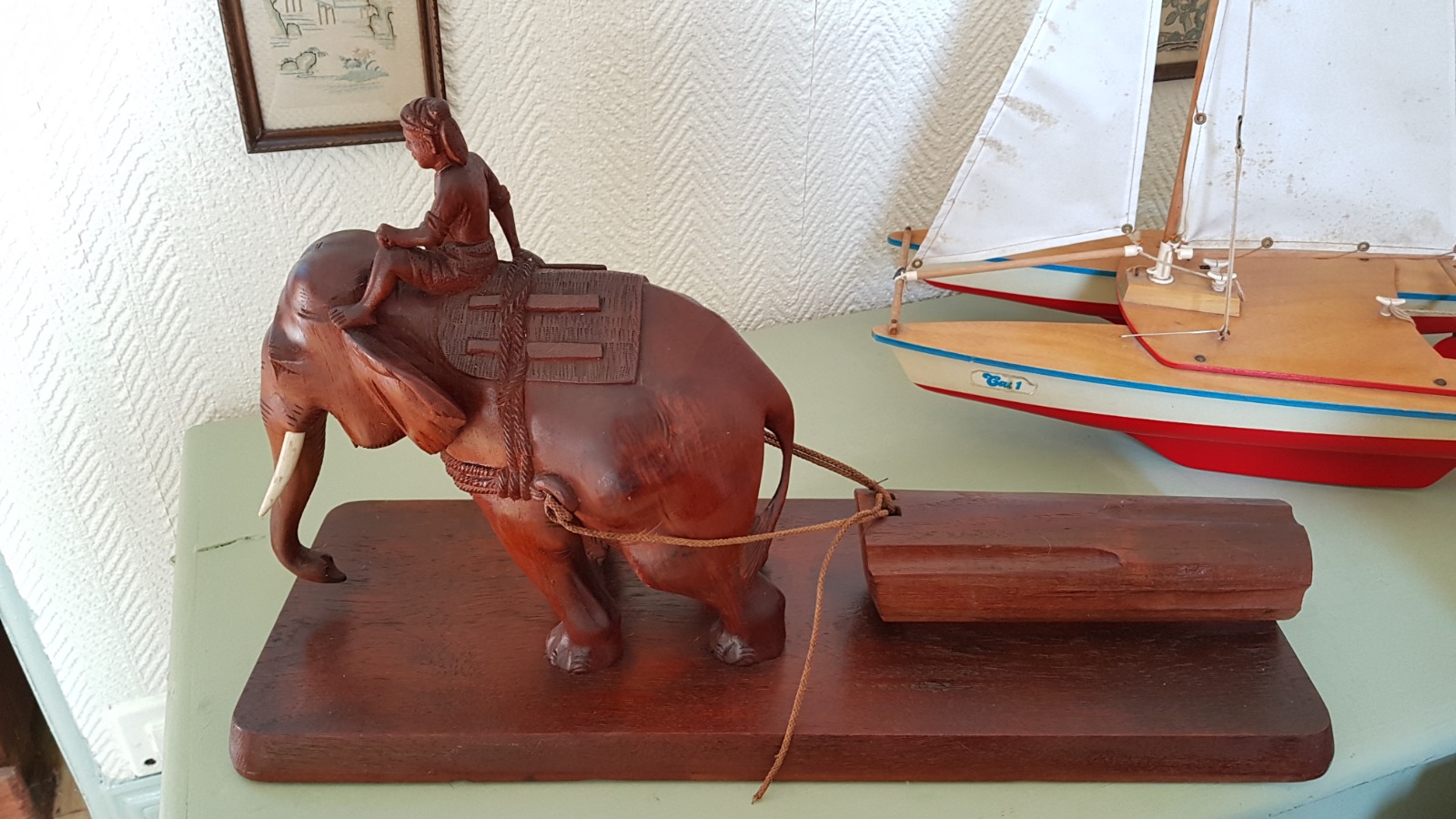 Very Large 1930s Woodcarving - Logging Elephant with Trainer, Burmese Teak