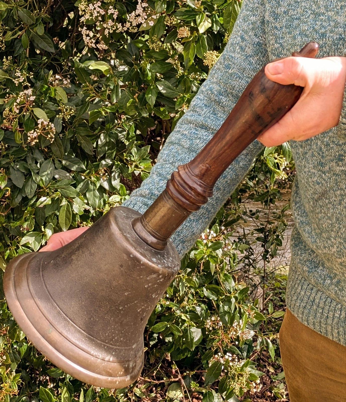 This is a good really large solid bronze hand bell in excellent condition with long turned handle in solid polished wood. The bell rings very loudly and is much larger than the norm being 46cm in height by 20cm in diameter.
