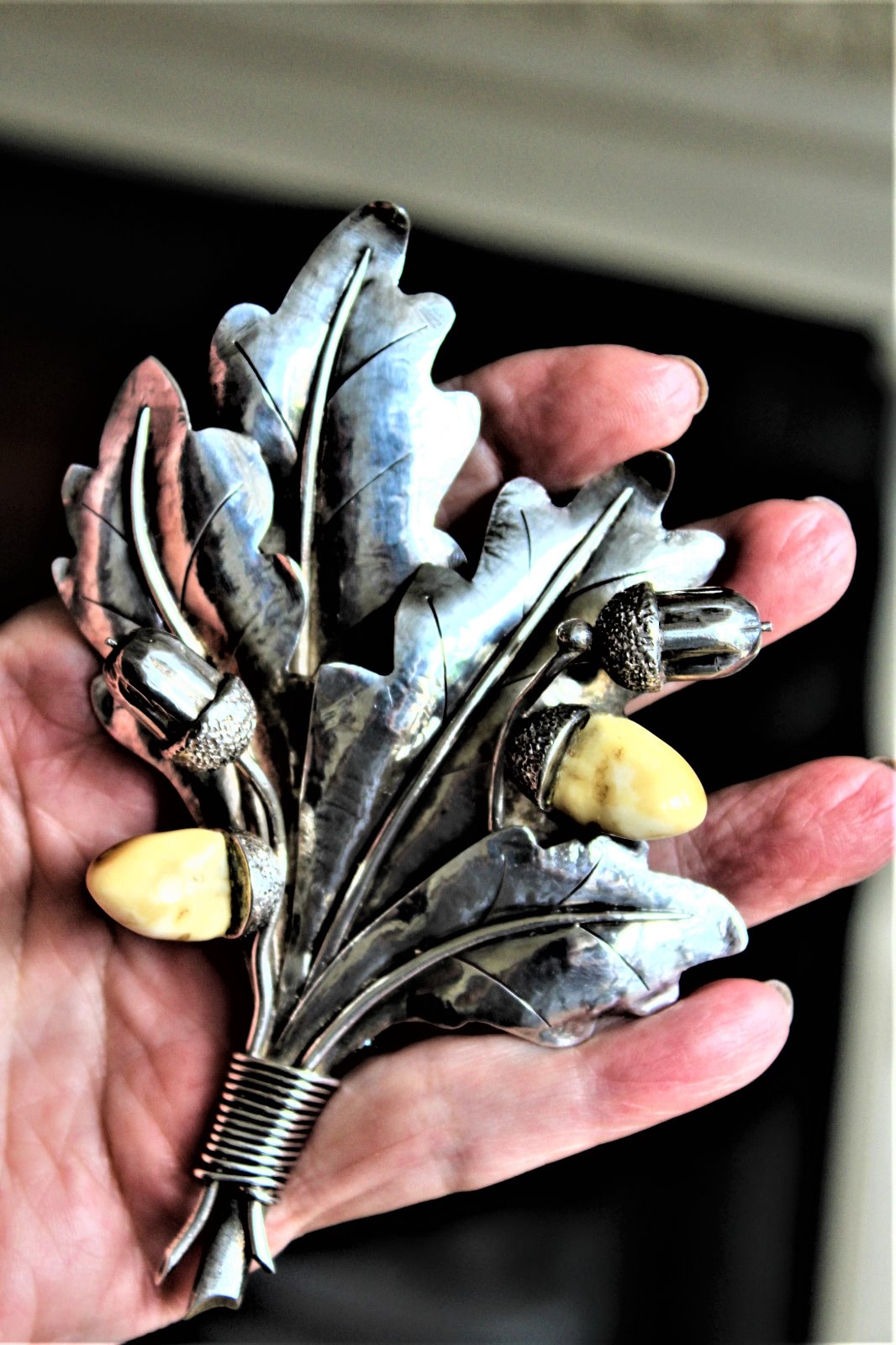 Very Large & Beautiful Handmade Silver Brooch of Leaves & Acorns Unmarked Possibly French c.1900 to 1940