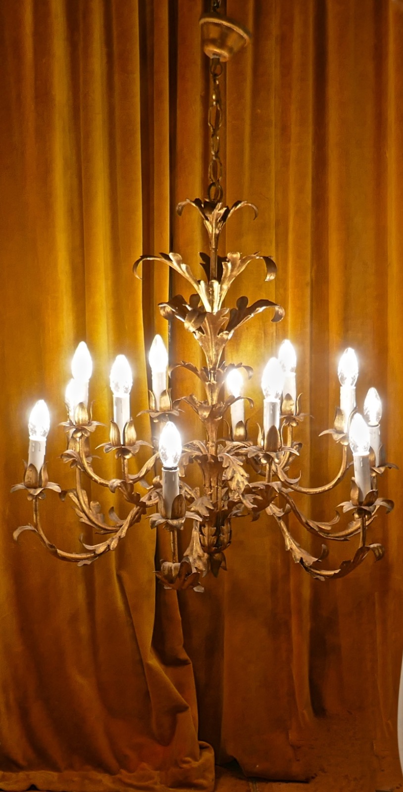 Very Large French 12 Branch Gold Tole Chandelier c.1900