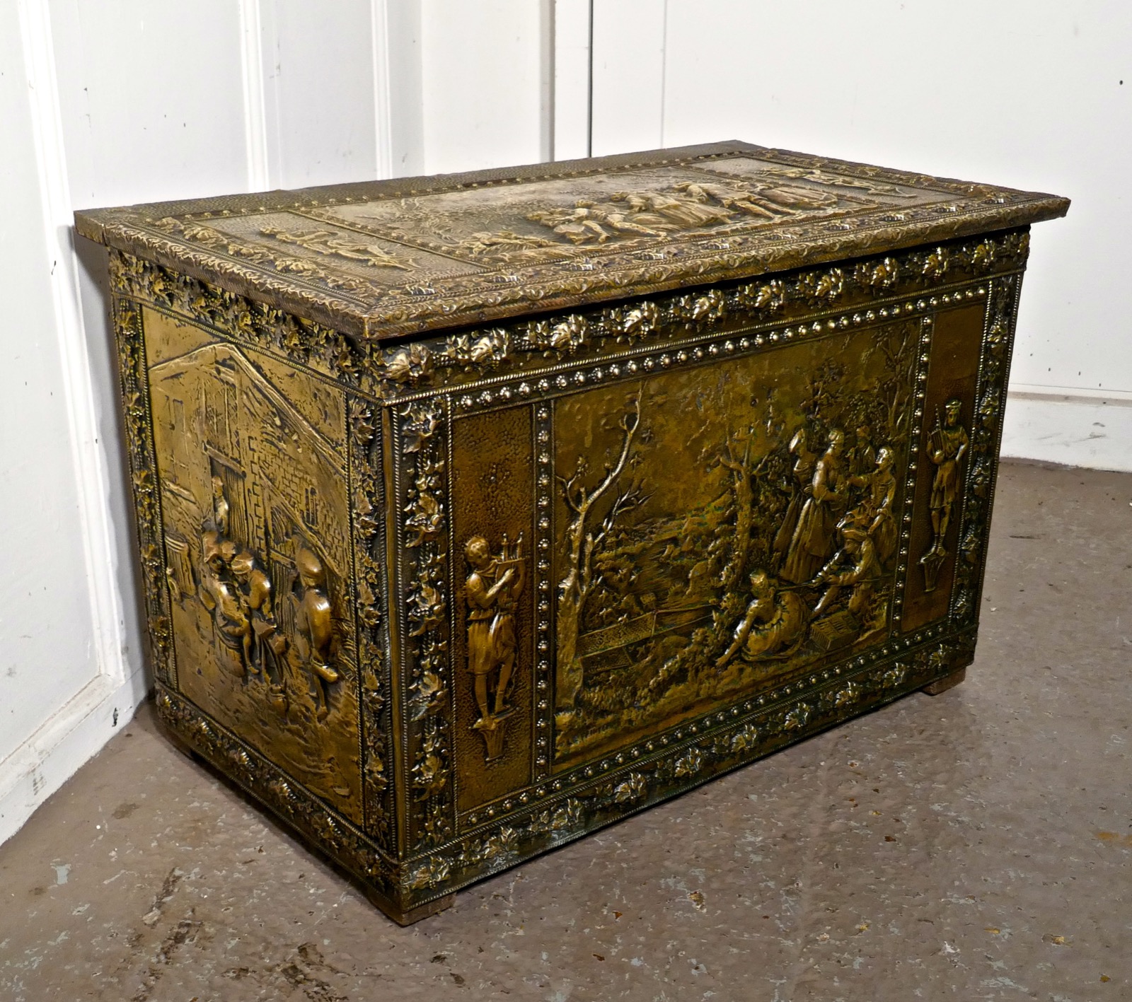 Very Large French Embossed Brass Log Box, with Country Scenes