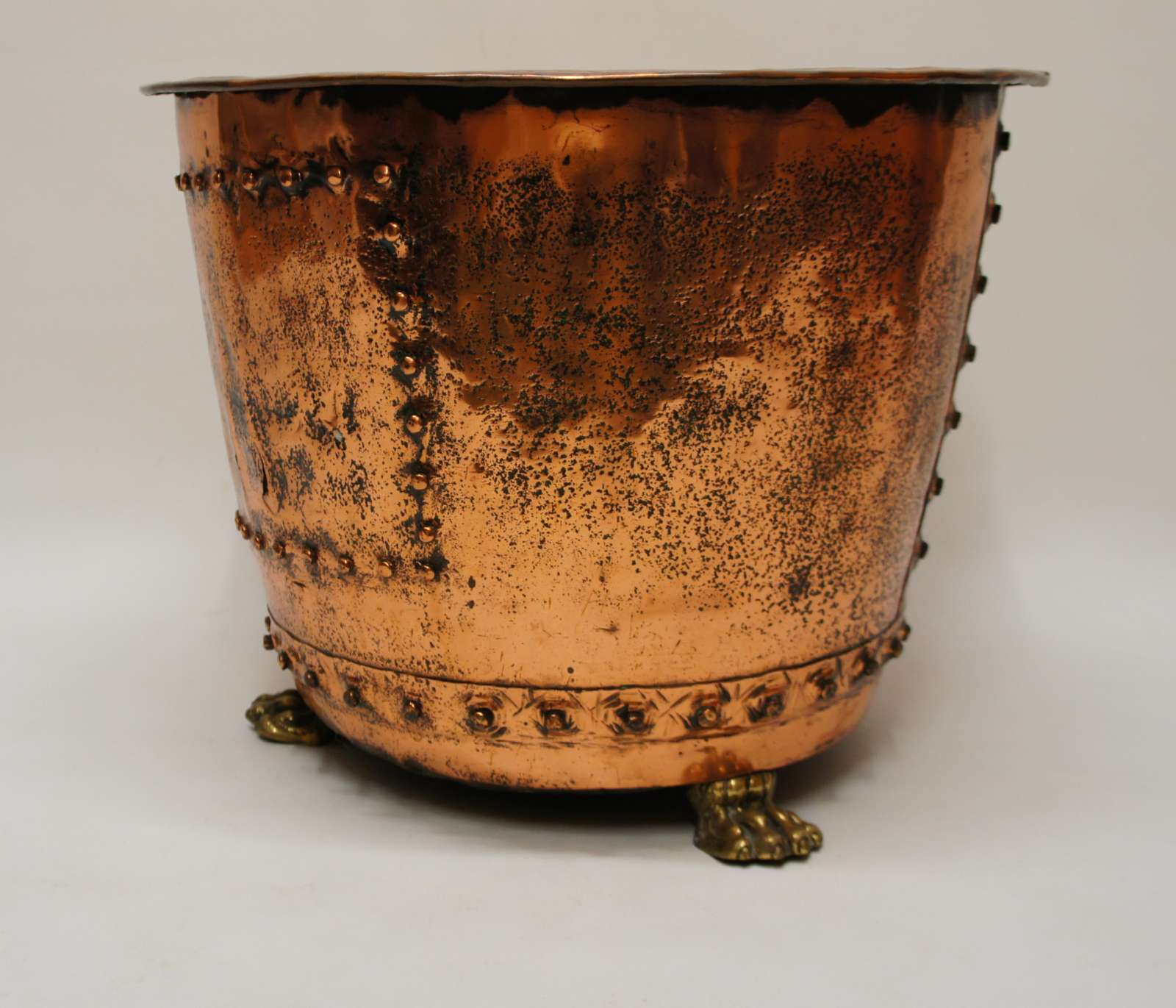 Very Large Late Victorian Studded Copper Fireside Log Bin or Planter on Feet