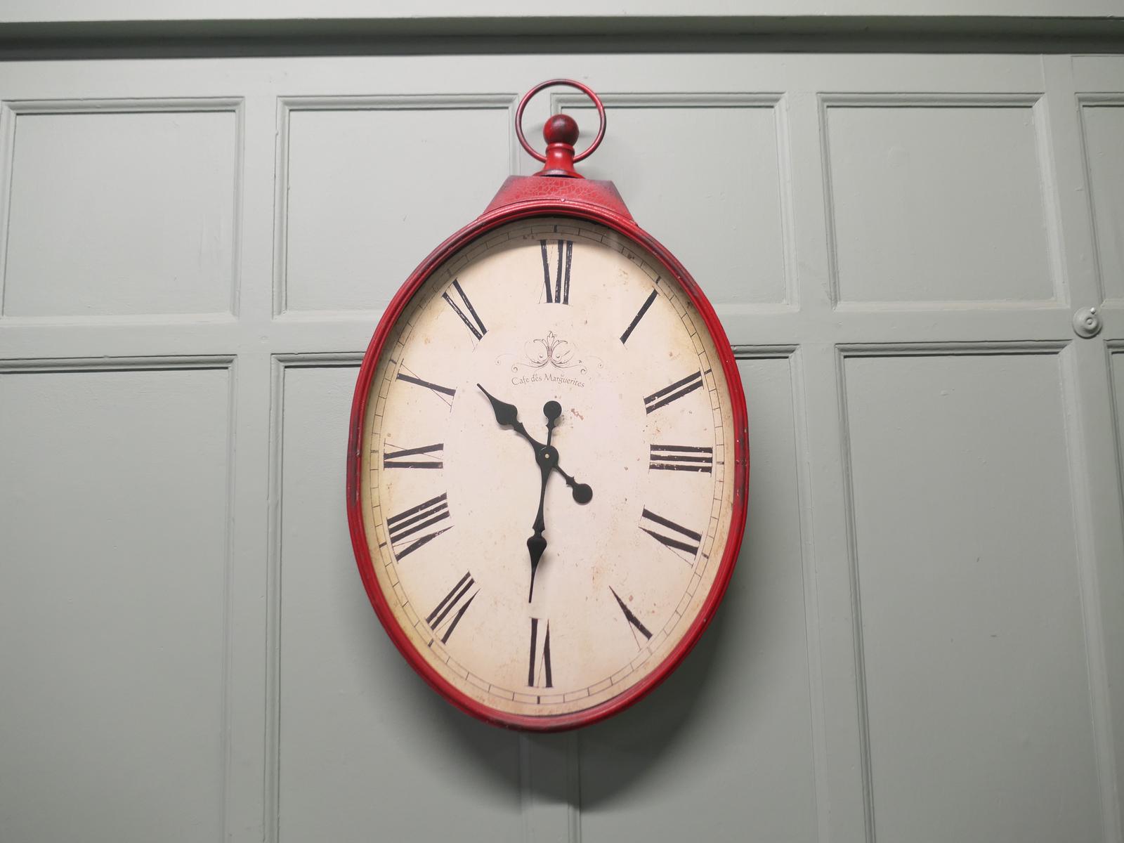 Very Large Retro Chic French Bistro Wall Clock This is a large piece, the clock has an oval frame with white face and black hands, it is has a rather age weathered condition with a few blemishes. The clock is in very good attractive condition, it has a little natural weathering to the case and face but it is sound. The clock is 4” deep and 38” x 22” Ref: DG45