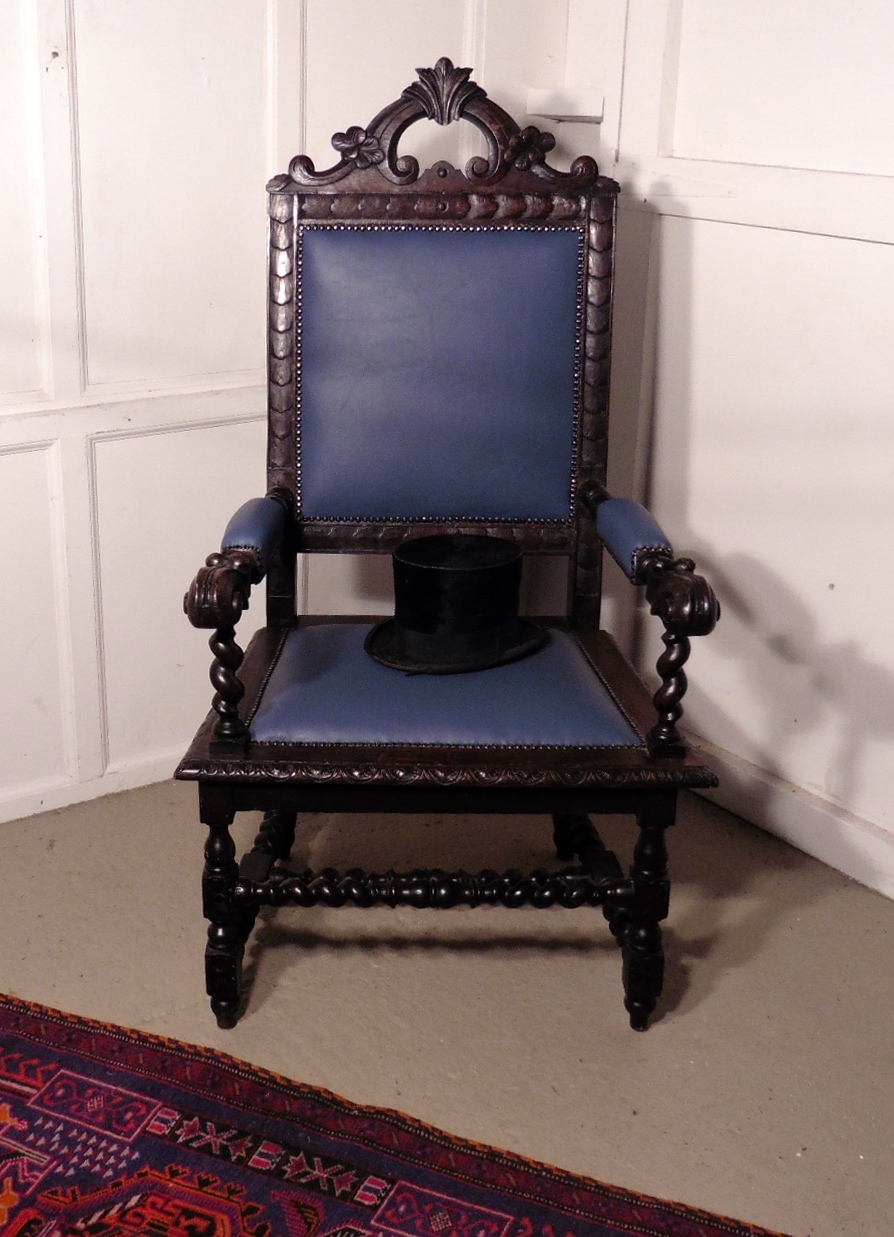 Very Large Victorian Carved Oak & Leather Armchair