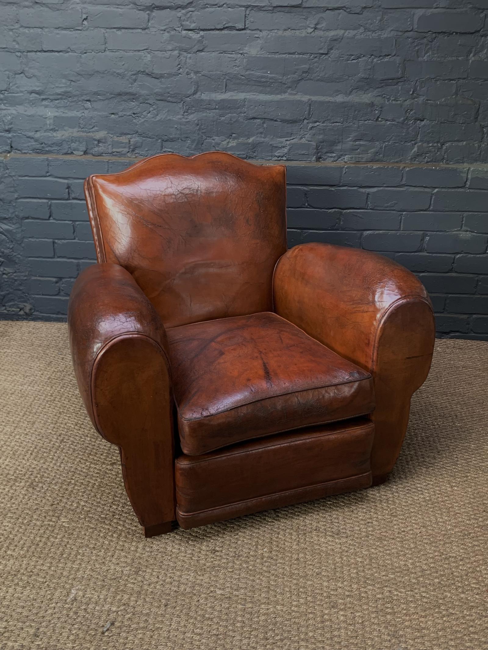 Very Lovely French Leather Club Chair, Moustache Model, with Cigar Arms, Circa 1930's