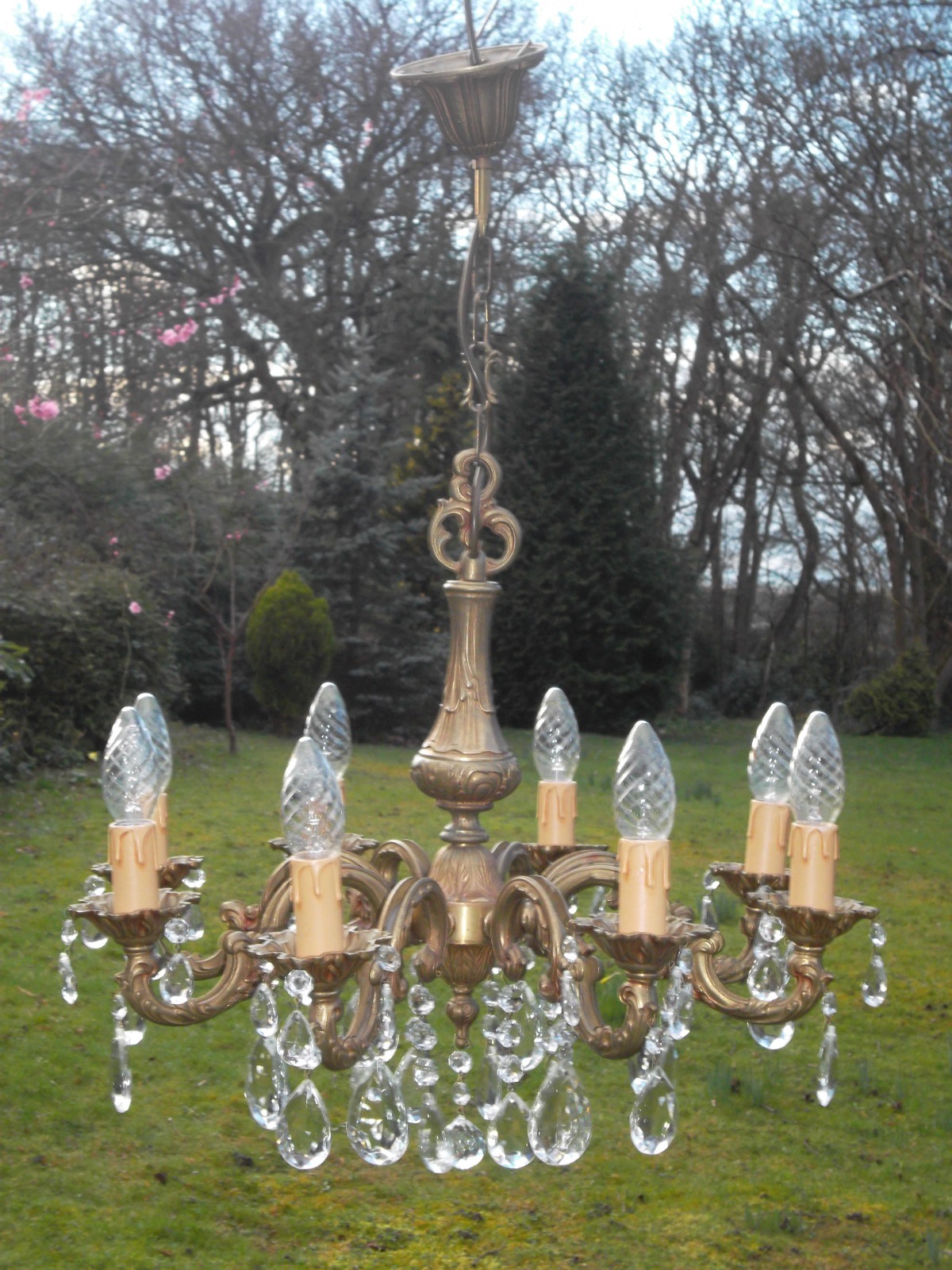 Very Pretty Vintage French 8 Arm Bronze Chandelier with Drops