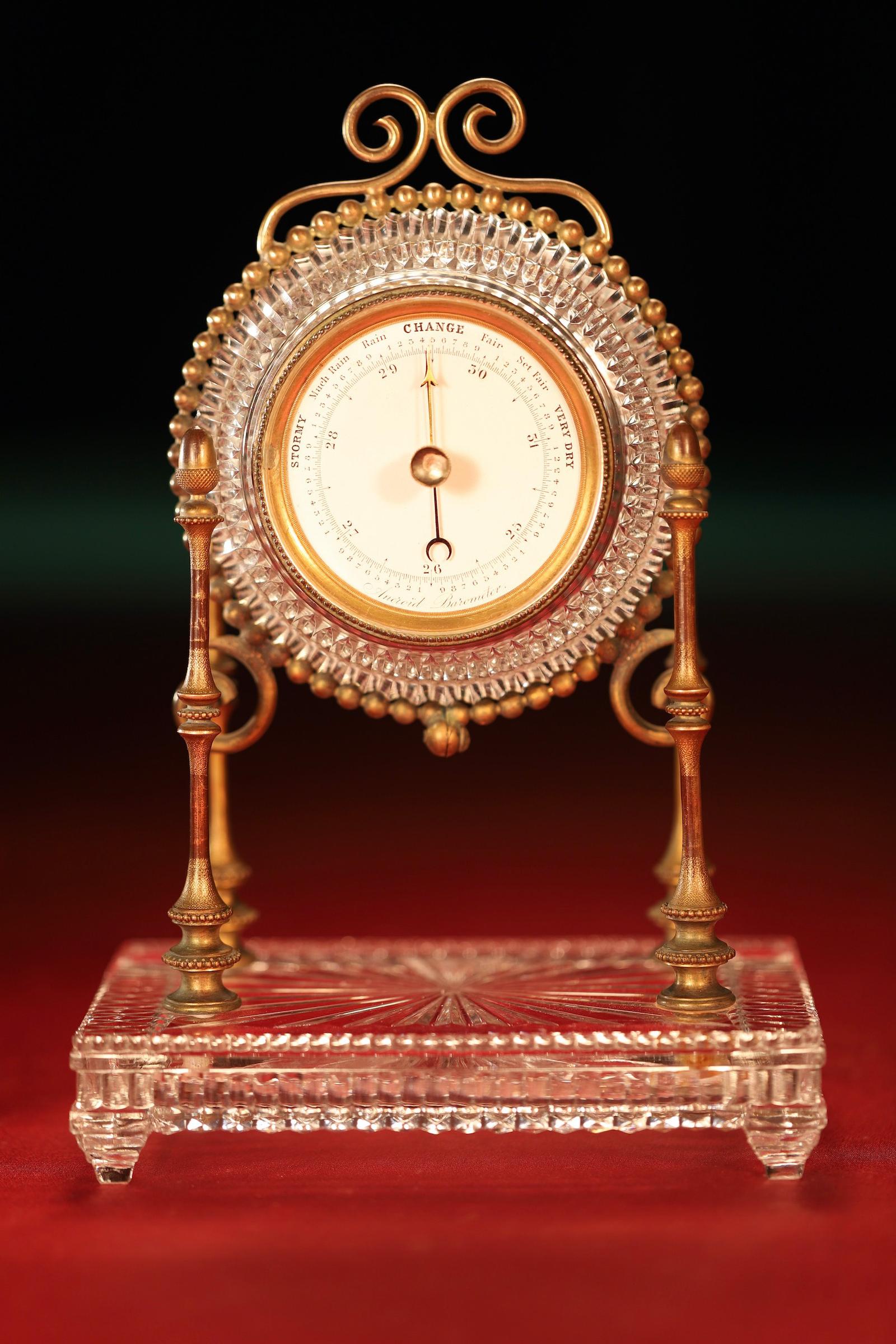 A good quality French aneroid barometer set in a most unusual faceted glass and ormolu mantle or table stand c1860.