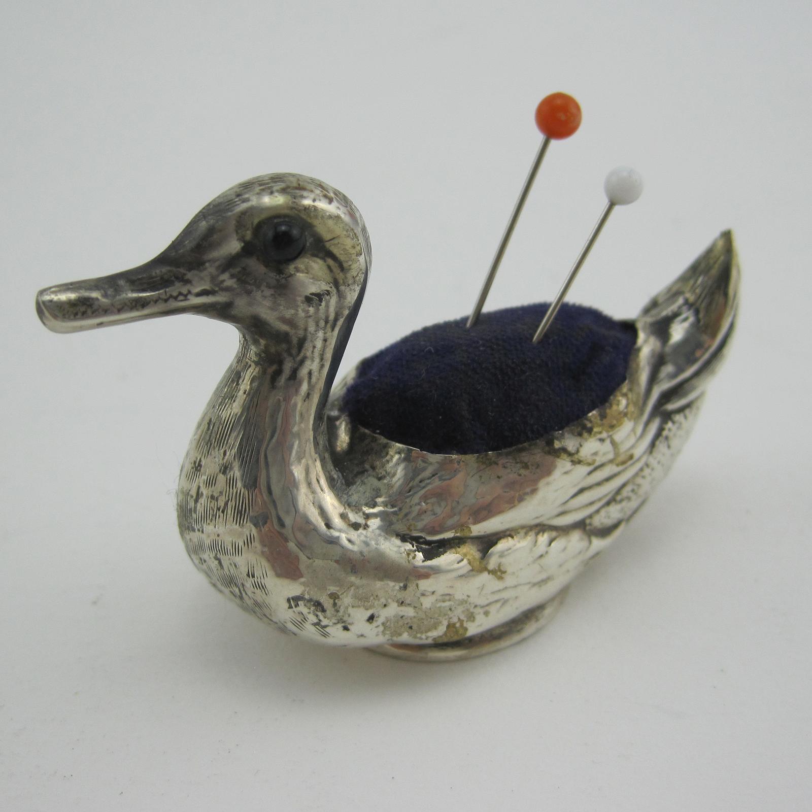 Very Well Modelled Silver Duck Pin Cushion with Glass Eyes (1 of 6)
