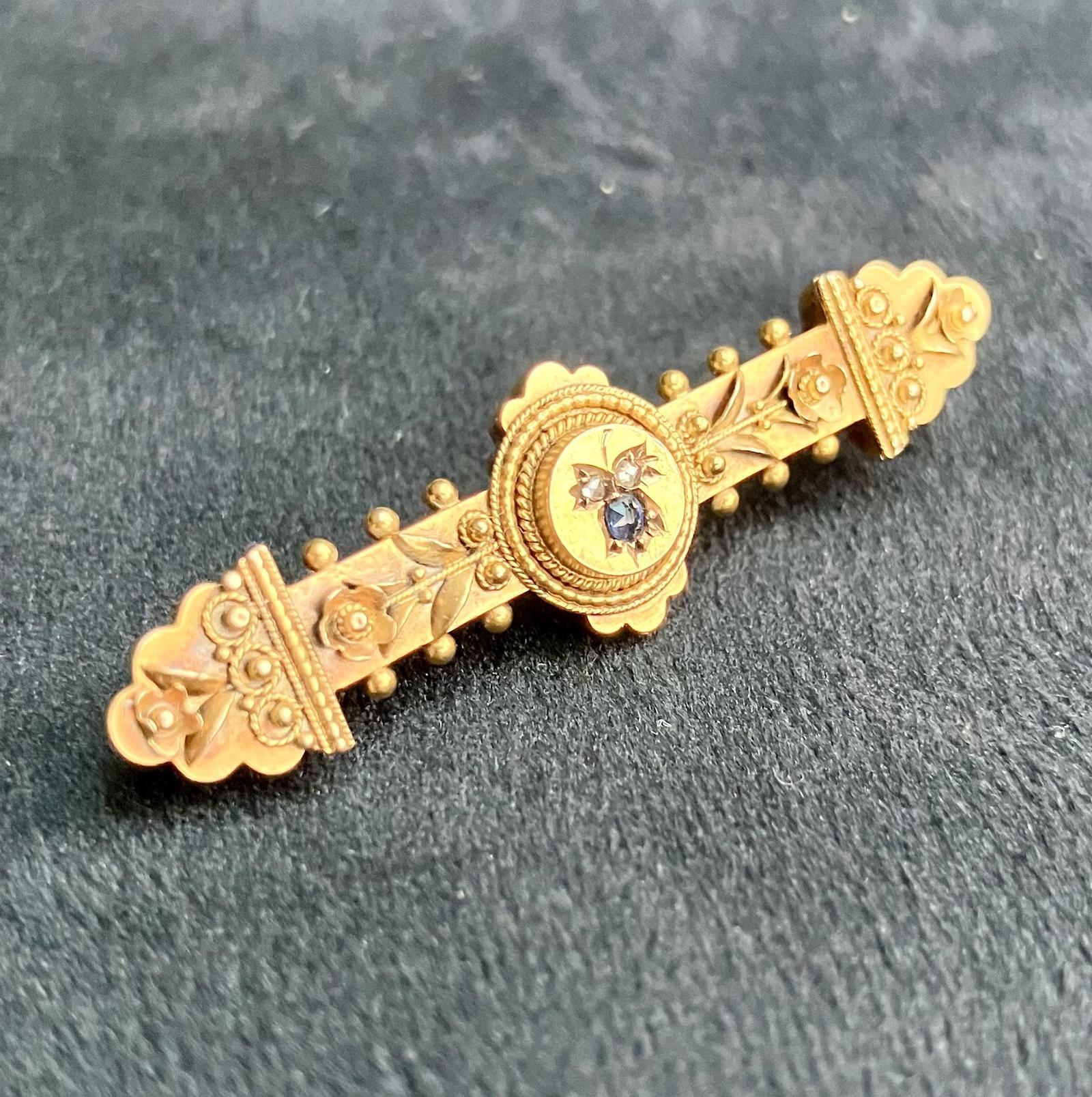 Edwardian 9ct Gold Garnet & Seed Pearl Bar Brooch