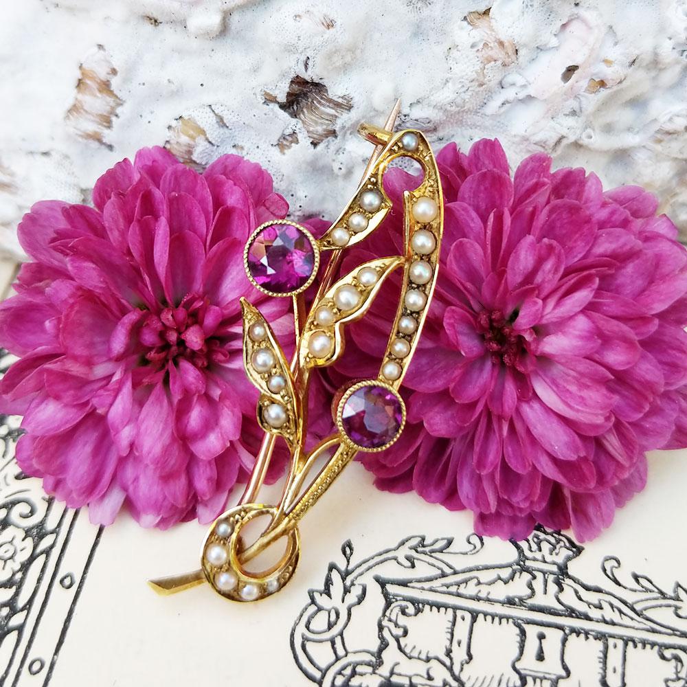 Victorian 15ct Gold, Garnet & Pearl Floral Moon Brooch