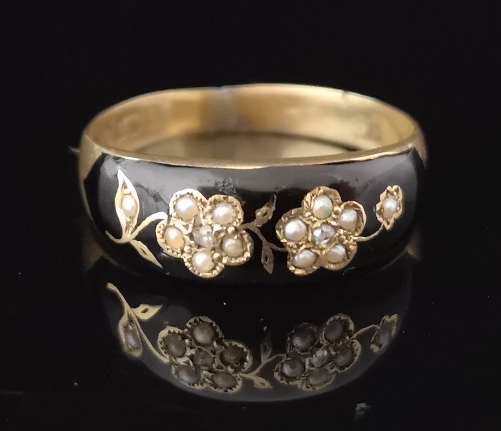 Victorian 15ct Gold Mourning Ring, Black Enamel, Diamond & Pearl
