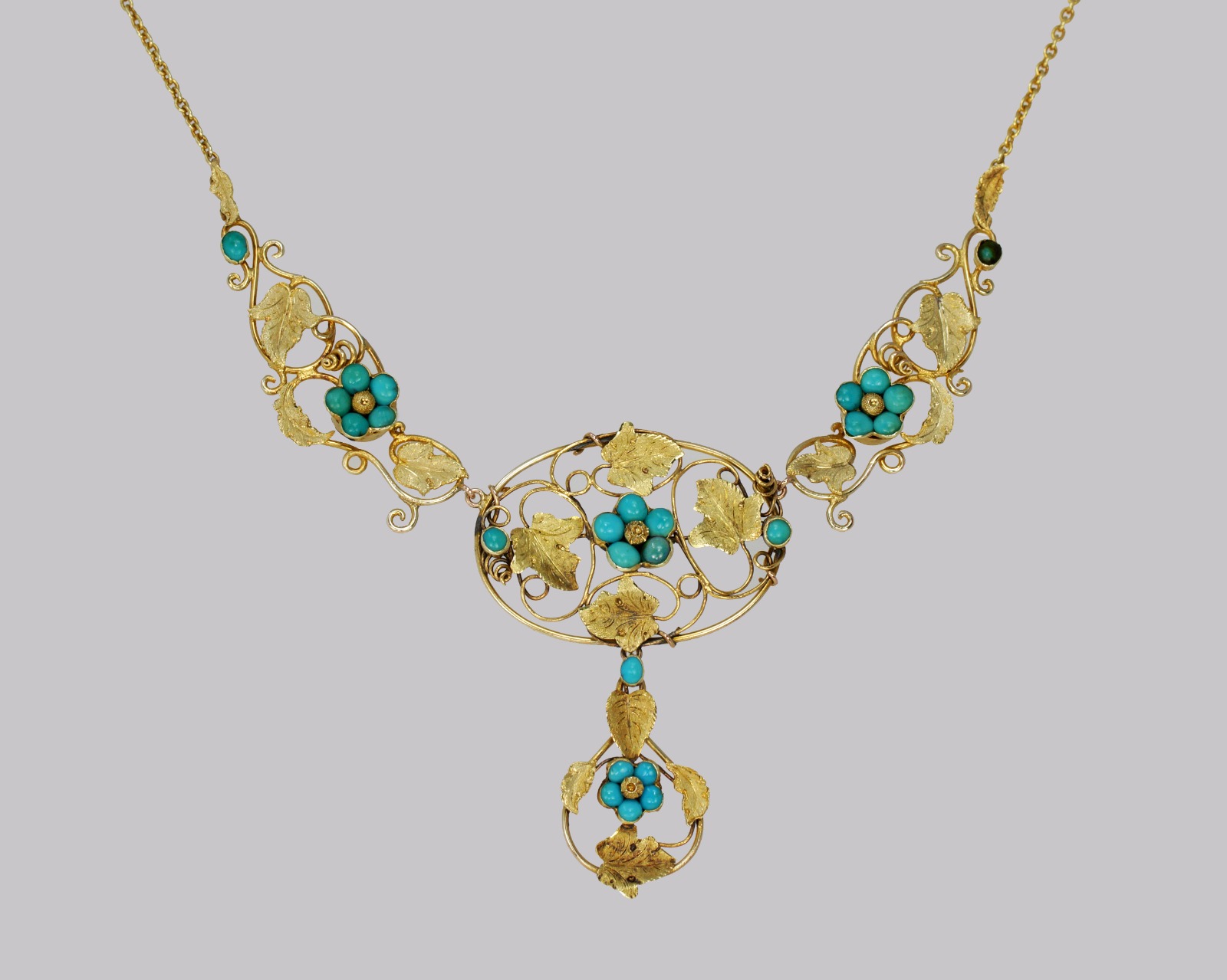 Victorian 15ct Gold Turquoise Necklace Antique Floral Scroll Necklace c.1860