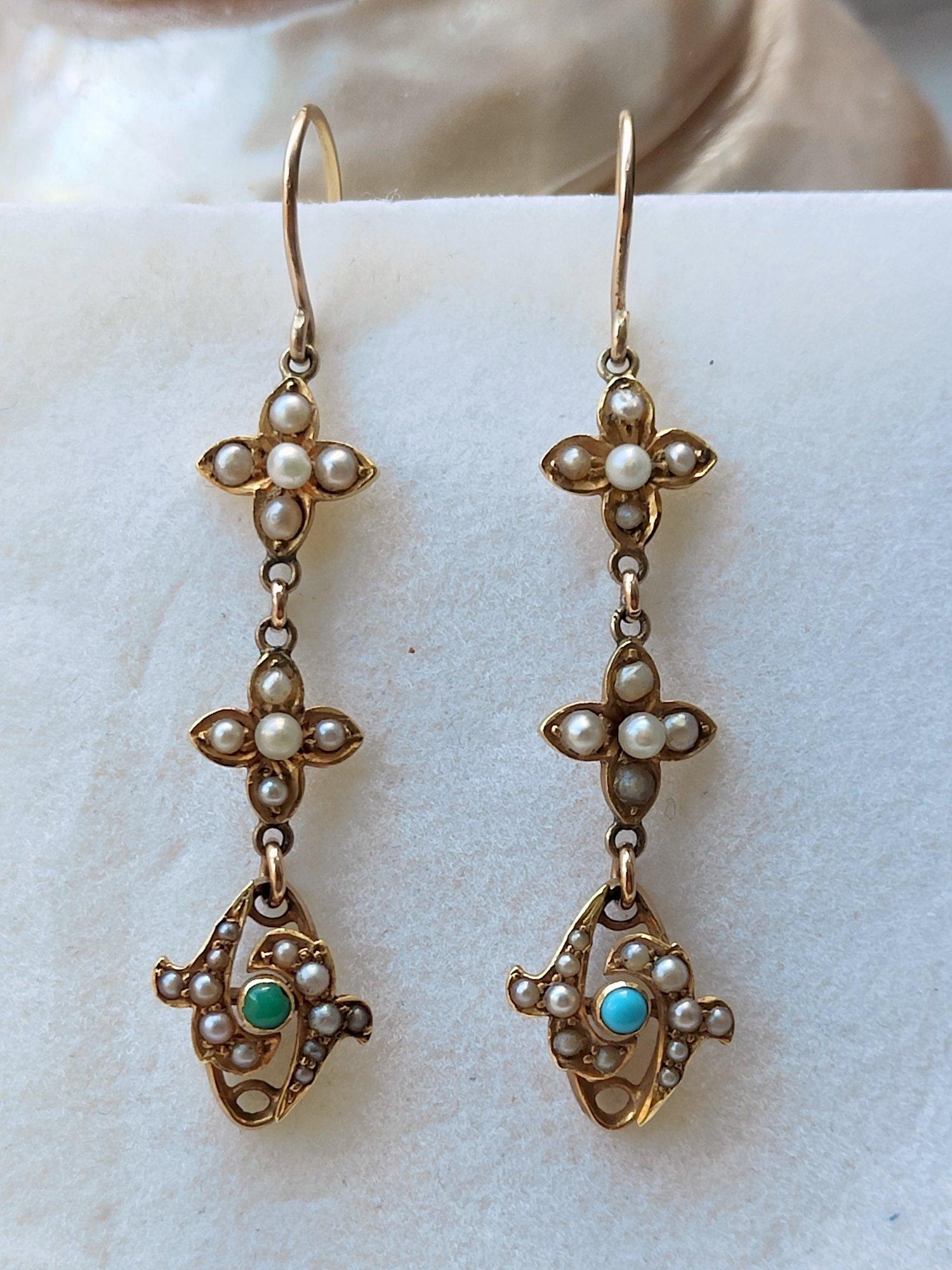Victorian 15ct Gold Turquoise Pearl Earrings (1 of 8)