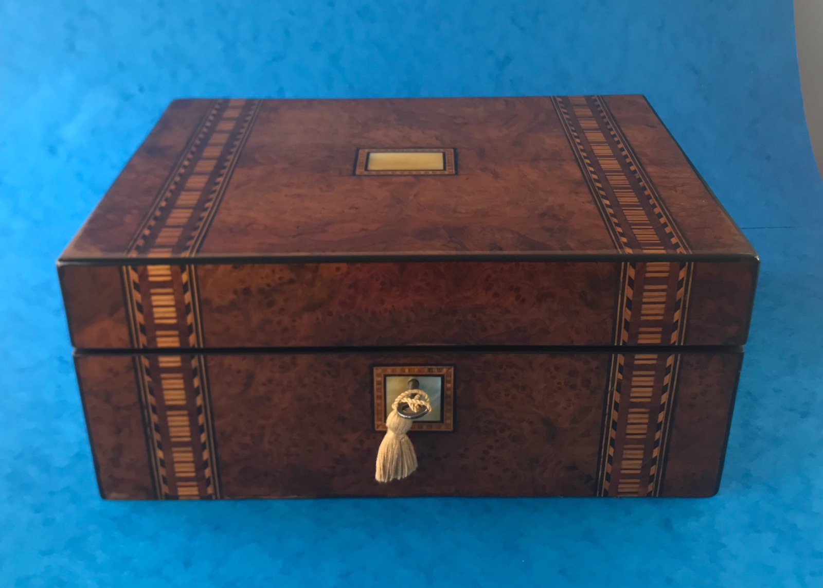 Victorian 1870 Inlaid Burr Walnut with Tunbridge Ware Banding Box