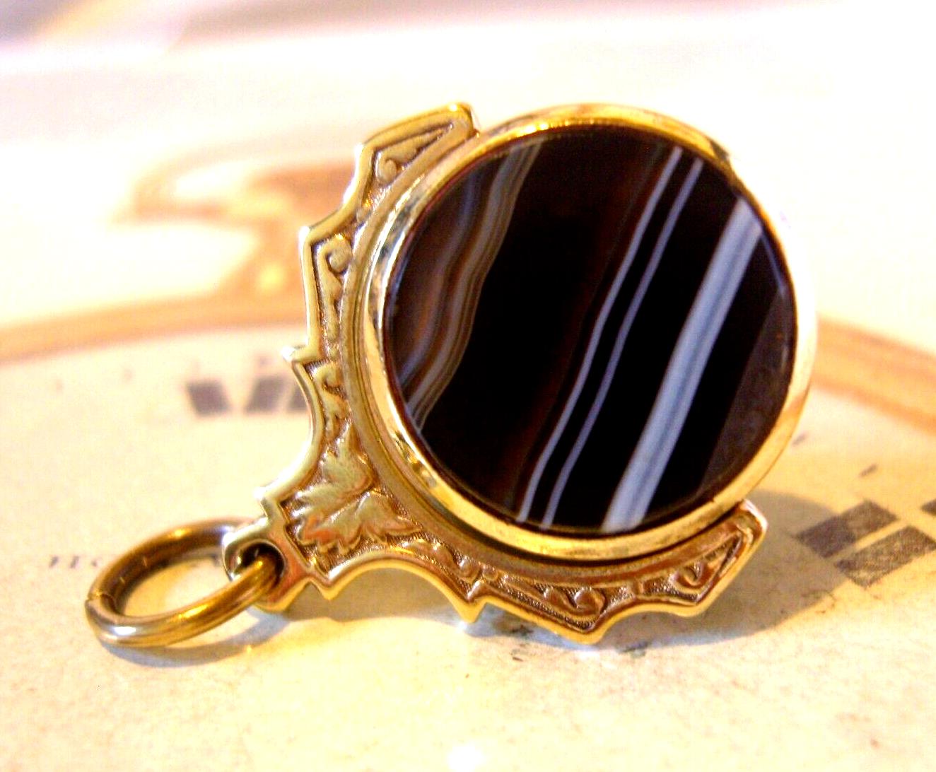 Victorian 1890s Pocket Watch Chain Fob Antique Large Brass & Agate Spinner Fob