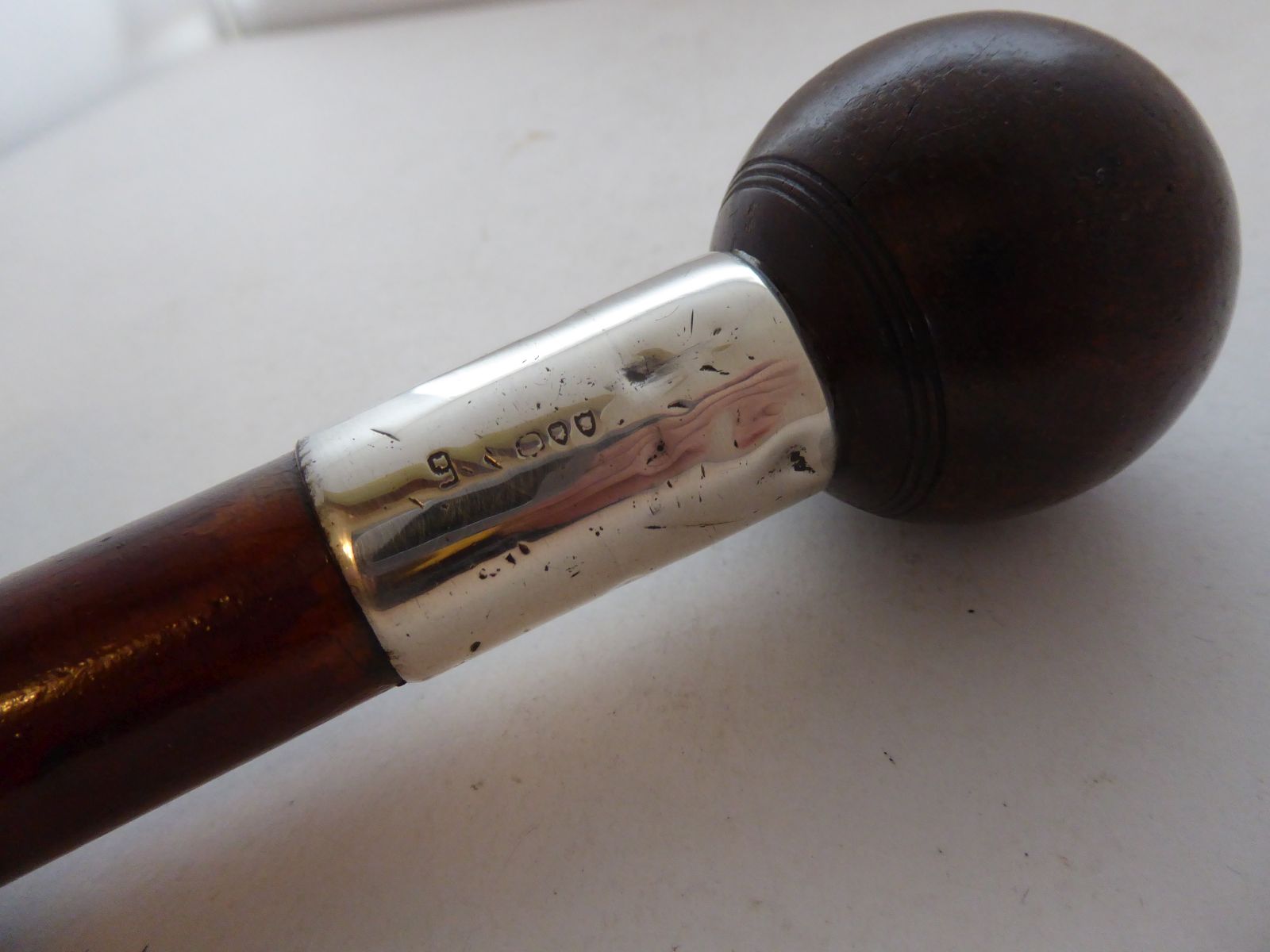 Victorian 1893 Malacca Walking Stick Cane Silver Collar Lignum Vitae Pommel