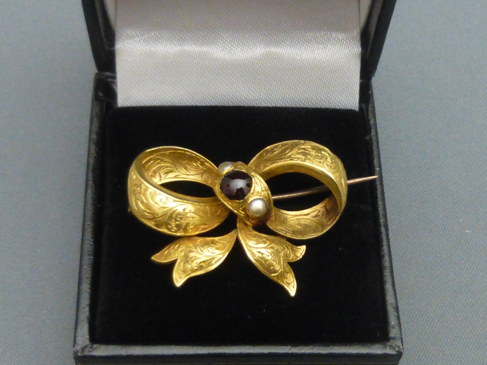 Victorian 18ct Gold ,Garnet and Pearl Bow Brooch